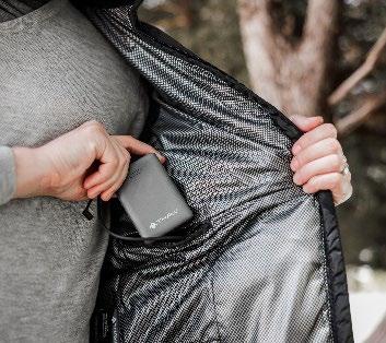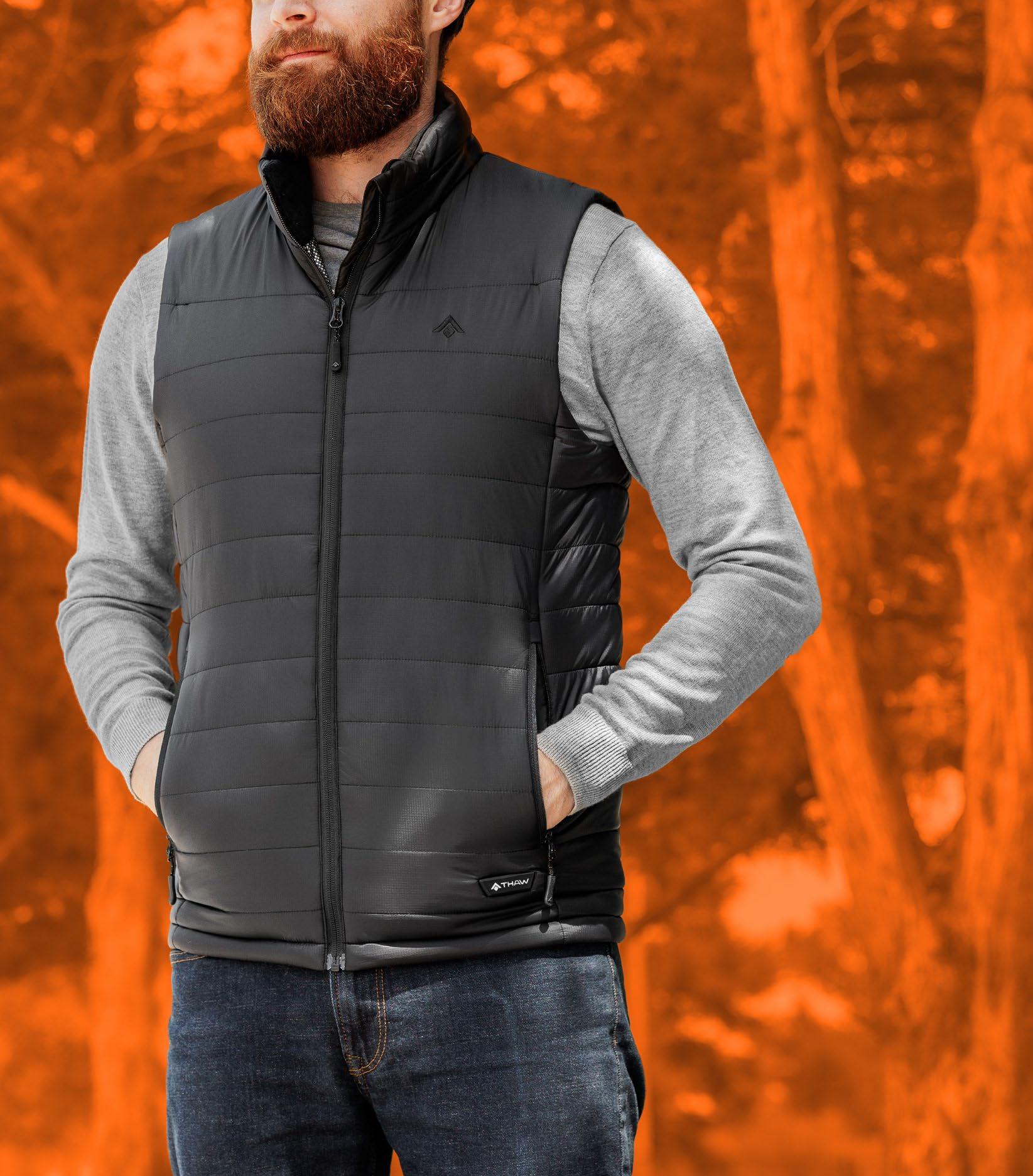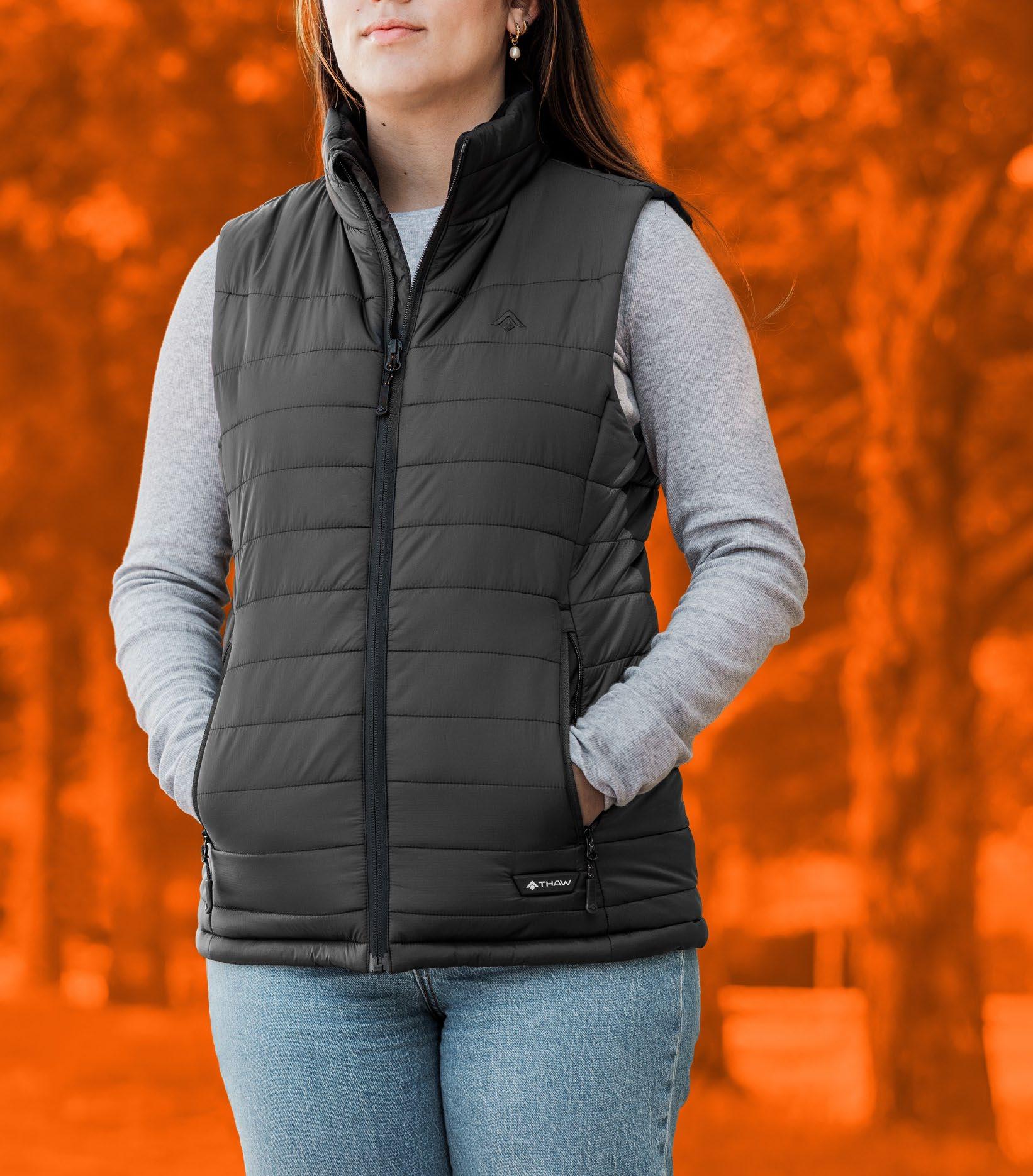 The THAW Rechargeable Heated Vest provides 4 strategically placed heating zones to keep your core warm and comfortable, even in the coldest conditions. Designed with silver mylar thermal fabric and carbon fiber heating elements, the vest ensures efficient heat retention and comfort . Powered by a 7 . 4 v 10 , 000 mAh powerbank , it delivers over 9 hours of consistent warmth .