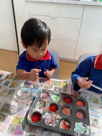 Beautiful colours through experiments and crafts have been a lovely welcome focus for the children of the Junior Room. Using food colouring hidden underneath the baking soda, the colour magically appears once the children add pipettes of vinegar. Giving children the opportunity to build on their colour recognition and hand-eye coordination through science. Making rainbows from clouds with coloured paper supports the colour focus this week - so pretty!