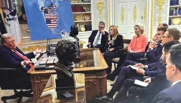 A imagem, aparentemente gerada por inteligência artificial, mostra Trump sentado no Salão Oval, em uma reunião com assessores e líderes europeus. Ao fundo, um mapa exibe os Estados Unidos ampliados para incluir os territórios do Canadá, da Groenlândia e da Venezuela, todos sob a bandeira americana. O presidente não acrescentou qualquer explicação ou comentário no texto que acompanhou a postagem.