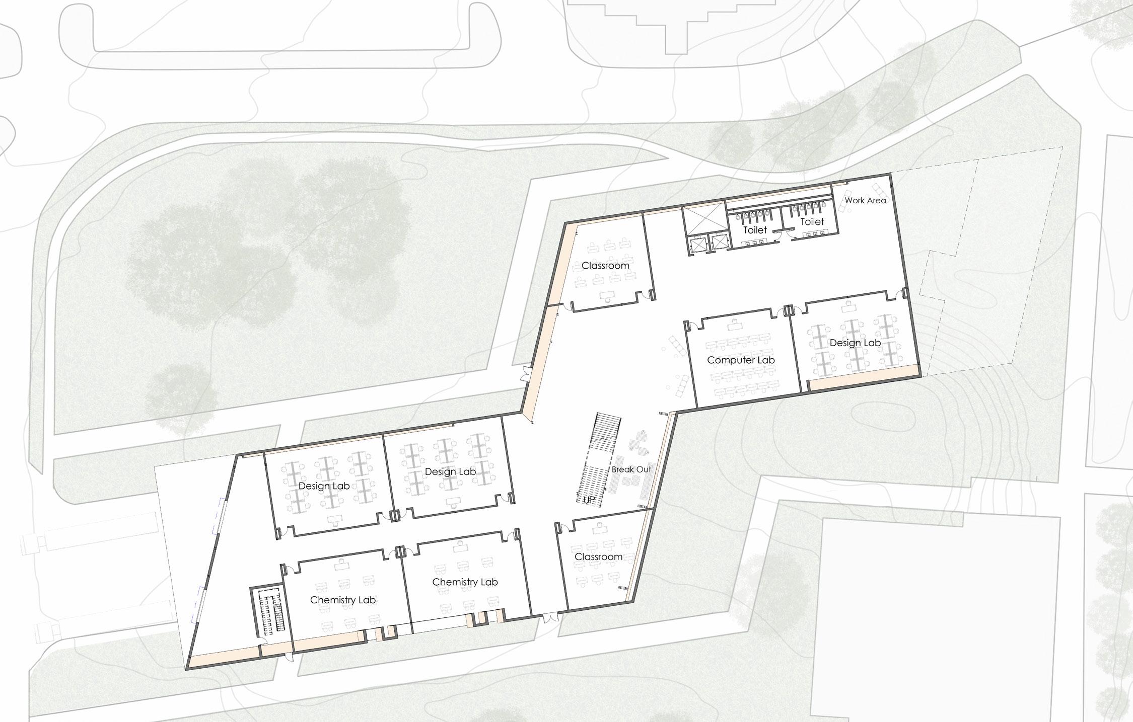 The Surge emphasizes the progression and energy of moving forward in science and technology. The form reflects this as it pushes toward the rest of campus. The program is organized to create hierarchy between administration and the student body while still allowing students to easily meet and work with their professors.