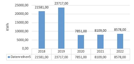 Am Beispiel der Lärchenwiese sieht man deutlich die Reduktion im Verbrauch (siehe Grafik). So wurden 2019 alle Laternen in der Lärchenwiese auf die neuen LED-Straßen laternen umgerüstet. Durch diesen Austausch können jähr lich ca. 66 % des Energieverbrauchs eingespart werden. Der leichte Anstieg in den Jahren 2021 und 2022 ist dadurch begründet, dass zusätzliche Laternen installiert wurden, um neue Straßenzüge zu beleuchten.
