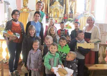 Die Kindergarten- und Volksschulkinder feierten mit Diakon Erwin Bachinger eine Erntedank-Messe. Magdalena Lindl beim Verkauf des selbstgebackenen Brotes.