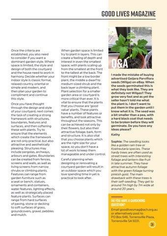 Once the criteria are established, you also need to consider if you want a dominant garden style. Where space is limited, the style and design of both the courtyard and the house need to work in harmony. Decide whether your indoor style is classic formal, relaxed country, oriental or simple and modern, and then plan your garden to compliment and continue this style. Once you have thought through the design and style of your courtyard, next comes the task of creating a strong framework with structures, boundaries, features and surfaces, and then softening these with plants. Try to ensure that the elements which create the framework are not only practical, but also attractive and aesthetically pleasing. Structures may include pergolas, archways, arbours and gates. Boundaries can be created from fences, screens and walls, as well as living screens from narrow shrubs or climbing plants. Features can range from garden furniture such as a seat or bench, statues, ornaments and containers, water features, lighting effects, as well as strategically placed feature plants. Surfaces can range from hard surfaces of paving, stone or decking to soft surfaces of grass, groundcovers, gravel, pebbles and mulch.