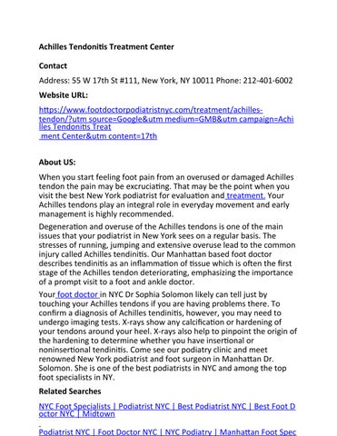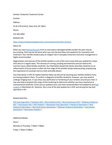 Phone: 212-401-6002 About US When you start feeling foot pain from an overused or damaged Achilles tendon the pain may be excruciating. That may be the point when you visit the best New York podiatrist for evaluation and treatment. Your Achilles tendons play an integral role in everyday movement and early management is highly recommended. Degeneration and overuse of the Achilles tendons is one of the main issues that your podiatrist in New York sees on a regular basis. The stresses of running, jumping and extensive overuse lead to the common injury called Achilles tendinitis. Our Manhattan based foot doctor describes tendinitis as an inflammation of tissue which is often the first stage of the Achilles tendon deteriorating, emphasizing the importance of a prompt visit to a foot and ankle doctor.