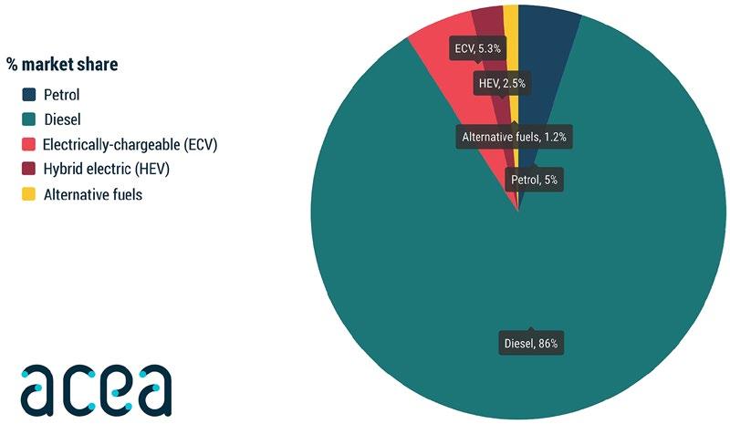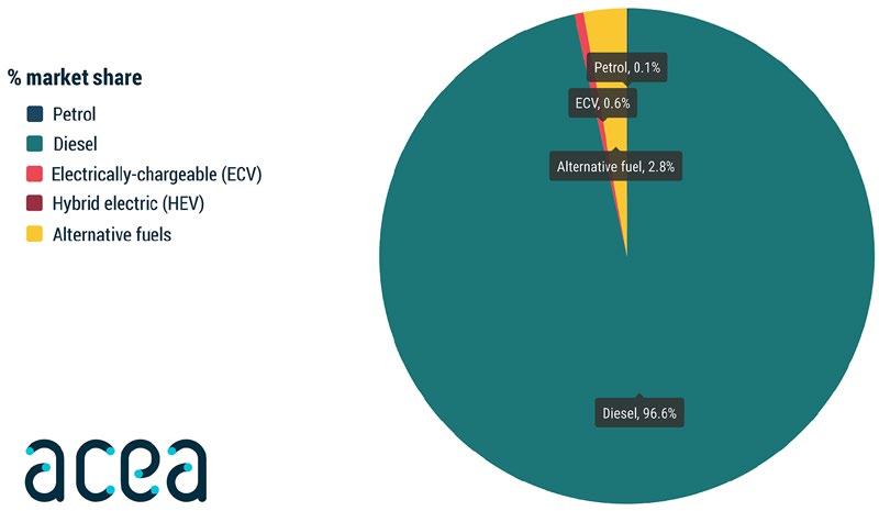 Nel 2022, i camion diesel sono rimasti la scelta dominante per gli acquirenti nell'Unione Europea, rappresentando il 96,6% del totale delle nuove immatricolazioni (rispetto al 95,9% nel 2021). Nonostante la crescita significativa dello scorso anno, i veicoli a ricarica elettrica (ECV, ovvero elettrici a batteria, a full-cell, ad autonomia estesa e ibridi plug-in) rappresentano ancora solo lo 0,6% del mercato