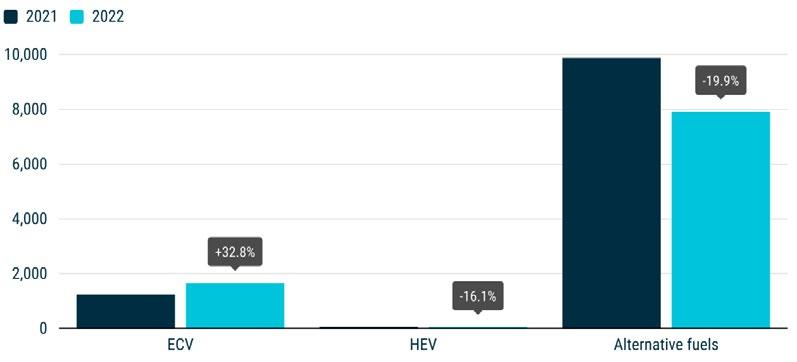 Le vendite di autocarri alimentati da carburanti alternativi, come gas naturale, GPL, biocarburanti ed etanolo nel 2022 sono diminuite, rappresentando il 2,8% del mercato totale (dal 3,6% del 2021). Con 7.915 autocarri immatricolati in tutta l'UE, le vendite di autocarri alimentati con carburanti alternativi sono diminuite del 19,9%.