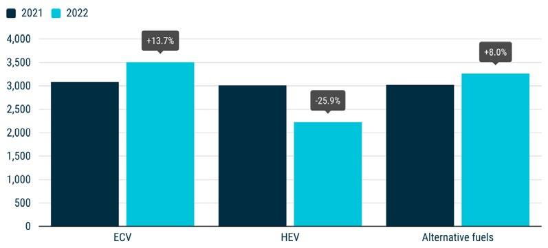 Sales of trucks powered by alternative fuels, such as natural gas, LPG, biofuels and ethanol, decreased in 2022, accounting for 2.8% of the total market (down from 3.6% in 2021). With 7,915 trucks registered across the EU, sales of trucks running on alternative fuels contracted by 19.9% Germany was the main contributor to the region’s negative performance of these trucks, with a decline of 34.2%.