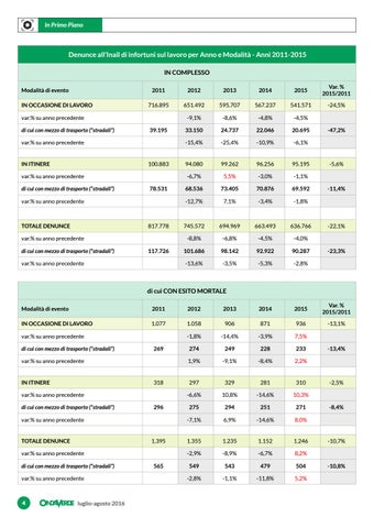 Denunce all’Inail di infortuni sul lavoro per Anno e Modalità - Anni 2011-2015 IN COMPLESSO Modalità di evento IN OCCASIONE DI LAVORO