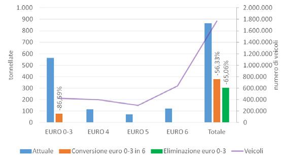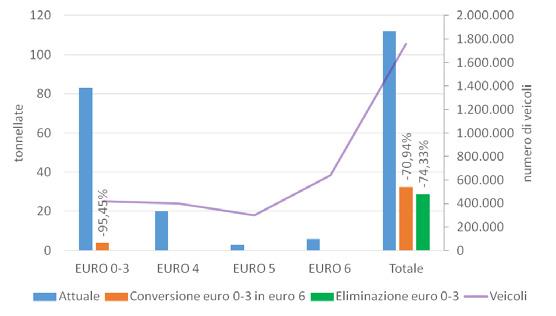 Potenziale emissivo annuale di PM (a sinistra) e di NOx (a destra) del parco auto romano a confronto con una prima ipotesi di sostituzione