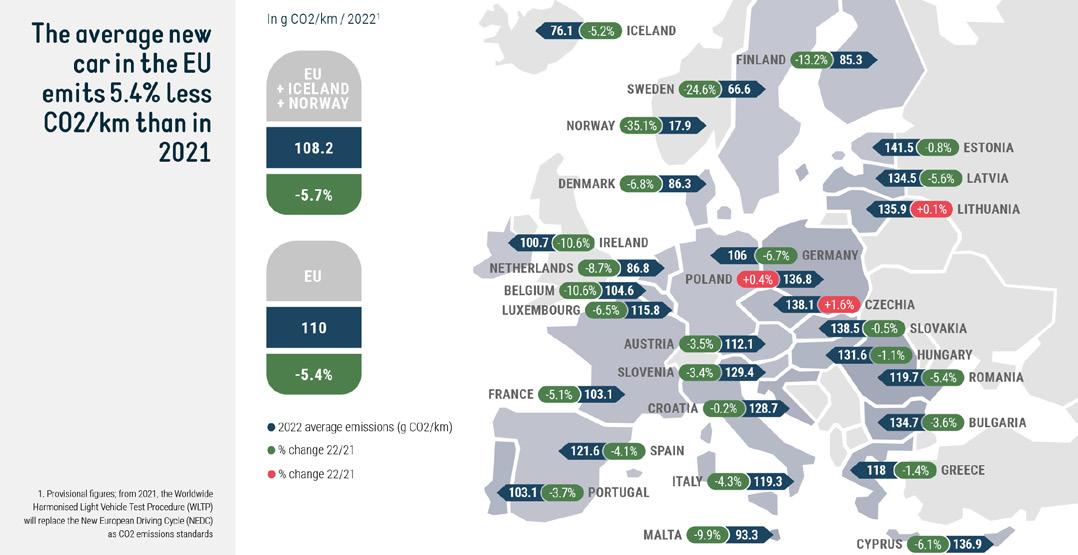 Grazie alla elevata quota di auto elettriche ed ibride circolanti a fine 2022, la Norvegia detiene il migliore risultato a livello di emissioni medie di CO2, solamente 17,9 g/km, in confronto ad una media europea, incluse appunto Norvegia e UK, pari a 138,5 g/km. A Estonia e Slovacchia spetta il record negativo di emissioni: rispettivamente 141,5 e 138,5 g/km CO2. L’Italia si pone leggermente al di sotto del valore mediano (128,7 g/km CO2 ascrivibile alla Croazia) con 119,3 g/km CO2, comunque in calo rispetto al valore registrato nel 2021, 124,6 g/km CO2, fattore che denota gli enormi sforzi profusi dalle industrie automobilistiche per la riduzione di CO2, nonostante le vendite ancora limitate di veicoli elettrici.