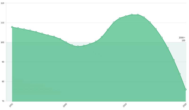 Il grafico mostra l’indice delle farfalle comuni, che costituisce uno degli indicatori dello stato della biodiversità in Europa. Si basa sulla popolazione di 17 specie di farfalle caratteristiche dei prati e pascoli europei e presenti in vaste zone d’Europa.