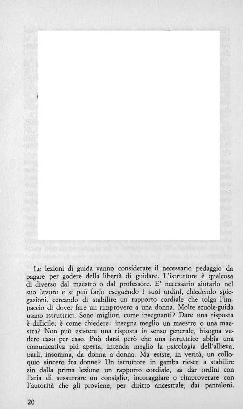 Resta però di fatto, prosegue Paolomba facendo proprie le ataviche istanze patriarcali dell’Italia degli anni ’60 che: “Un istruttore in gamba riesce a stabilire sin dalla prima lezione un rapporto cordiale, sa dar ordini con l’aria di sussurrare un consiglio, incoraggiare o rimproverare con l’autorità che gli proviene, per diritto ancestrale, dai pantaloni”. La conoscenza del Codice della Strada, complesso e assai vasto, va poi semplificato nel corso delle lezioni teoriche. Secondo l’autore, infatti, le donne sono “apatiche”