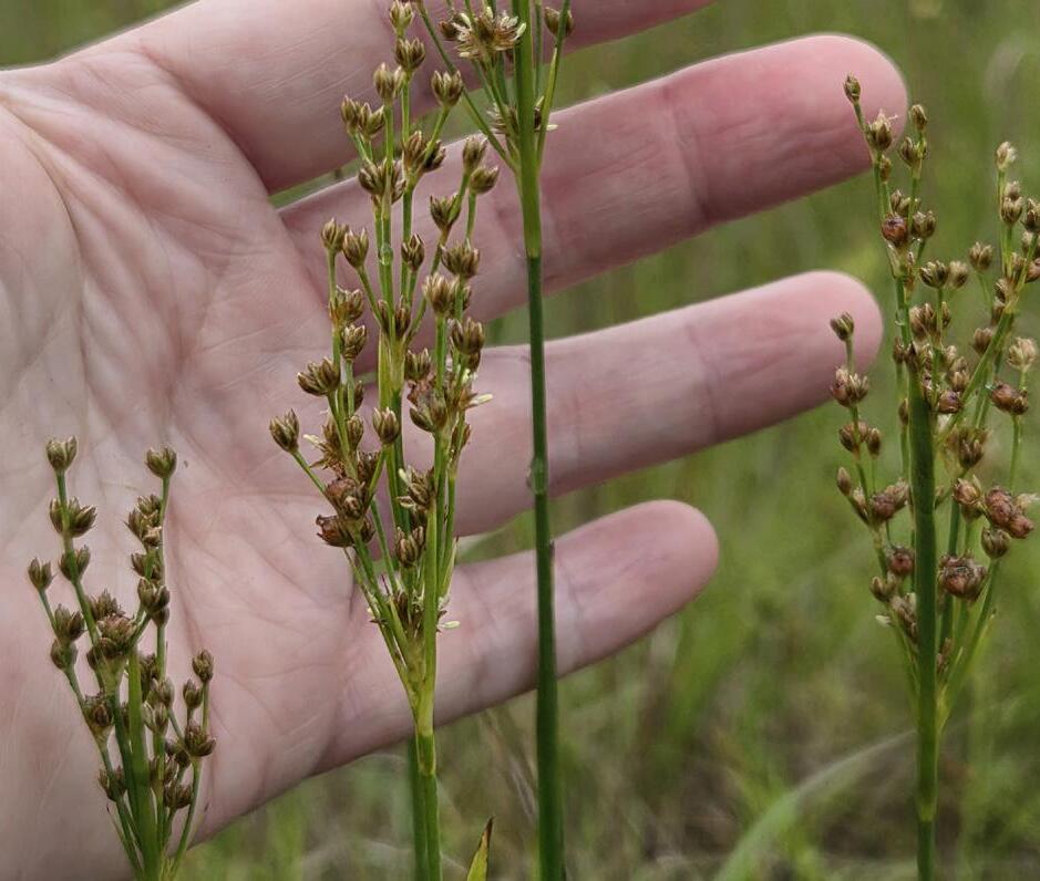 Not all rare plants are showy: the two-flowered rush is a good example. Known only in two counties and listed as Threatened in MA, this species easily flies under the radar. Like slender rose gentian, it inhabits the Coastal Plain pondshore “bathtub ring”–dependent on periodically low water levels and exposed sandy-peaty soil. In 2025, visiting botanist Peter Grima and NCF Plant Ecologist/Botanist Kelly Omand sat down for lunch and discovered they had found a large clump of these plants, near a historically known site. By reporting this record to the state, the site will become one of our future re-survey locations.