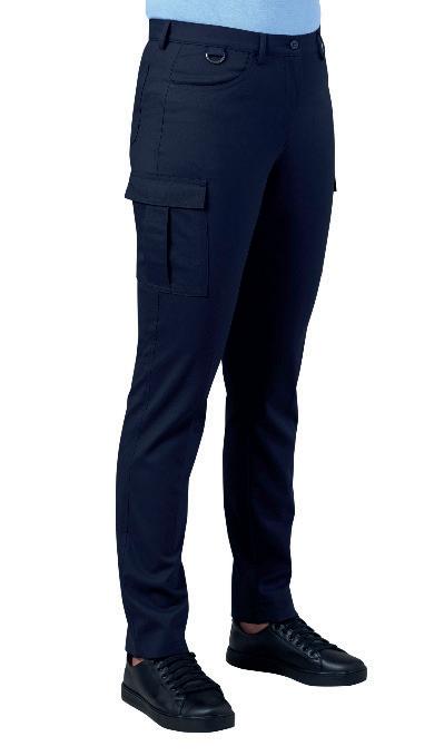 Mid-waisted, 2 cargo pockets, 2 hip patch pockets, 2 front pockets, button fastening, metal key loop.
