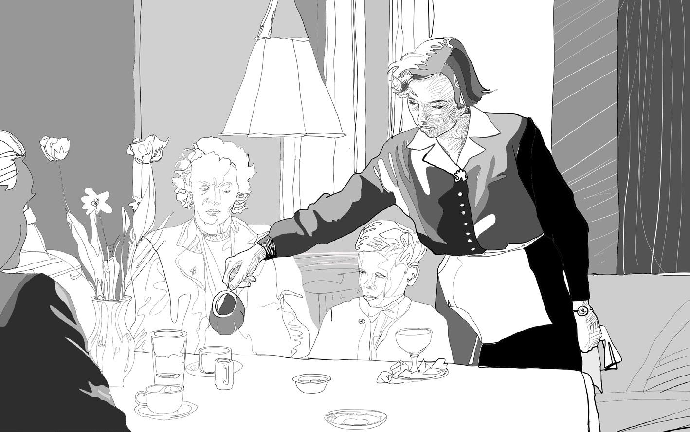 Nella casa del Commendatore abbiamo dovuto spartirci i compiti noi tre ragazze di Primiero: chi doveva fare la cameriera, chi la cuoca e chi doveva fare la sguattera. Allora abbiamo messo dentro ad un cestino dei bussolotti con dei bigliettini: mi sembra ancora di vederci noi tre ragazze in questa camera da pranzo grandissima. Abbiamo pescato a sorte e a me è toccato di fare la cuoca. Un’altra era padrona dei vetri e di tutto e guai a chi toccava la roba; l’altra invece faceva tipo la badante a ‘sti due vecchi, da governante. Era bello stare con il Commendatore, invece lei era sempre un po’ lunatica e non aveva tanta salute. Stava interi giorni a letto, e quando si alzava diceva: “Qui non va bene, qui non va bene, qui non va bene”. E il Commendatore diceva a sua moglie: “Ti devi accontentare”. Lei era più vecchia di lui. Lui era un tracagnòt cossì, però carino, sempre springo. Camminava sempre su e giù. Era una famiglia abbastanza ricca. Avevano dovuto lasciare molte cose a Tunisi, erano sfollati, però c’avevano i quattrini. Non so che lavoro facesse, so solo che un Commendatore.