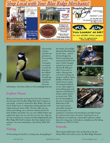 Explore Nature Bring your binoculars and step into the Great Outdoors this summer with the Blue Ridge Bird Seed Company as your guide. Located in downtown Blue Ridge, Tom and Sonya Striker have an independent birding specialty with regular bird and nature walks. The free walks are easy access and walking, not to mention relaxed and fun for both children and adults. You can meet skilled birders and explore hot spots you can visit later on your own. Sign up for their newsletter by visiting www.blueridgebirdseed.com. Blue Ridge Bird Seed Company also hosts regular nature seminars. For more information, call toll free (800) 5842473.