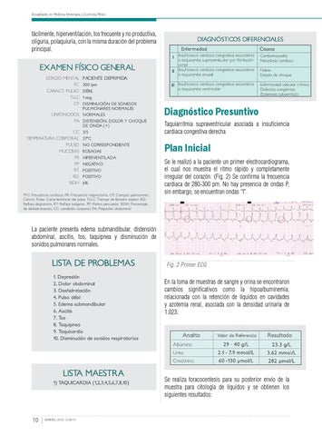 La paciente presenta edema submandibular, distensión abdominal, ascitis, tos, taquipnea y disminución de sonidos pulmonares normales. Fig. 2 Primer ECG