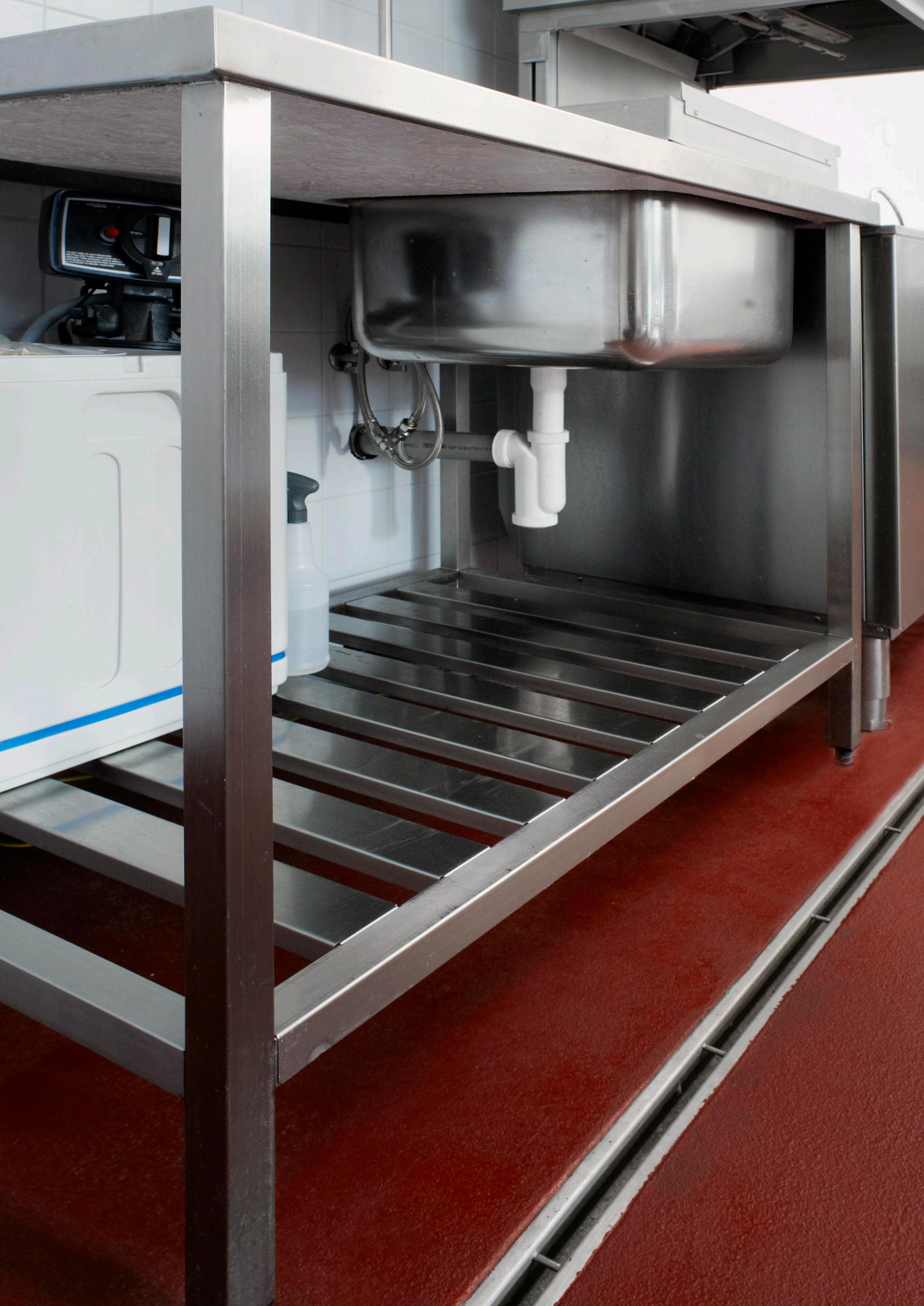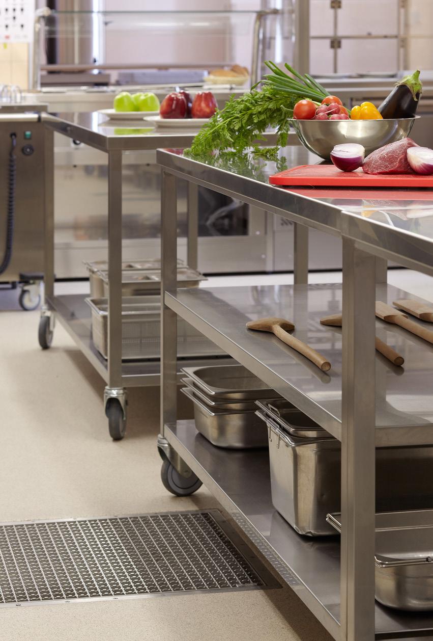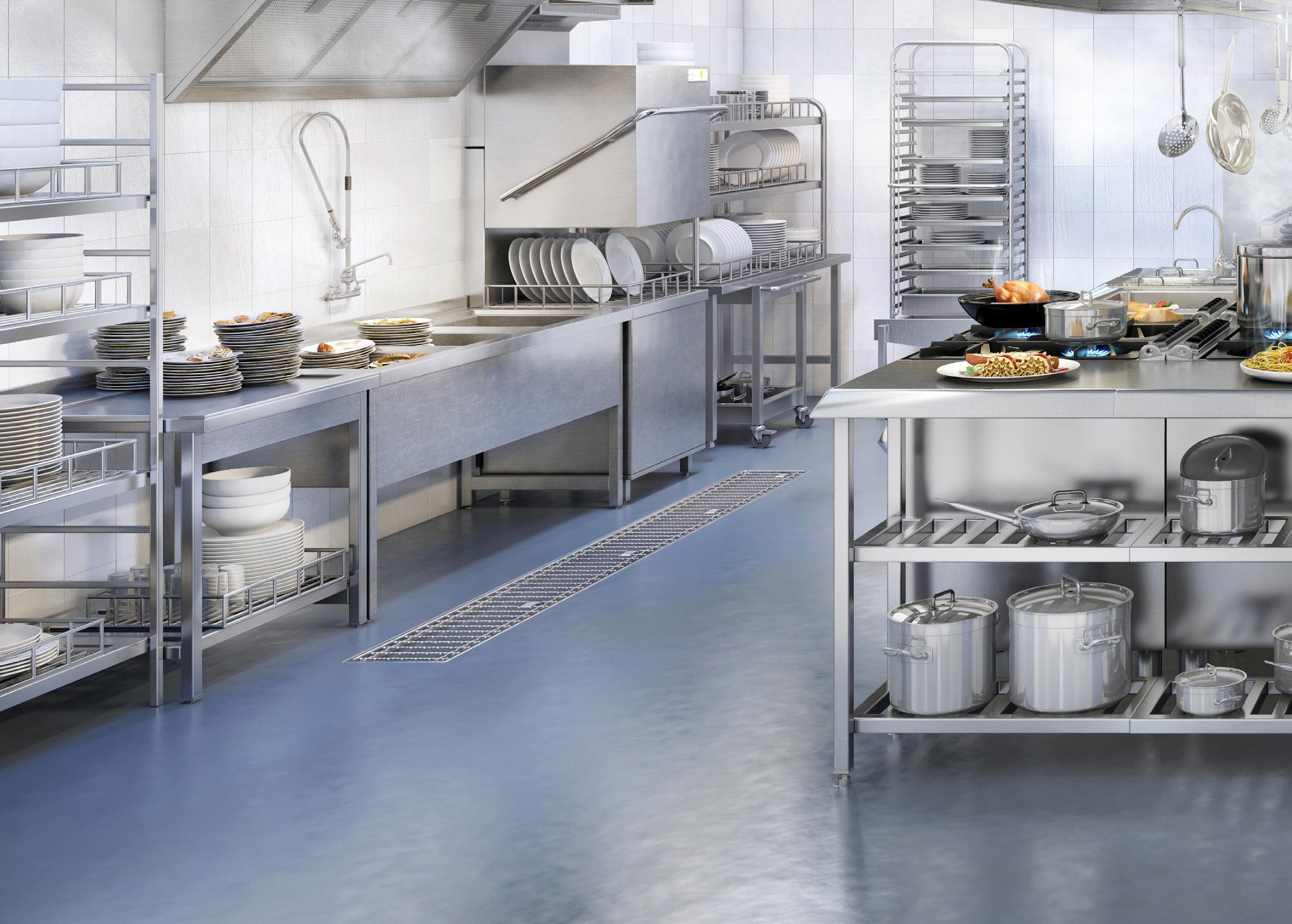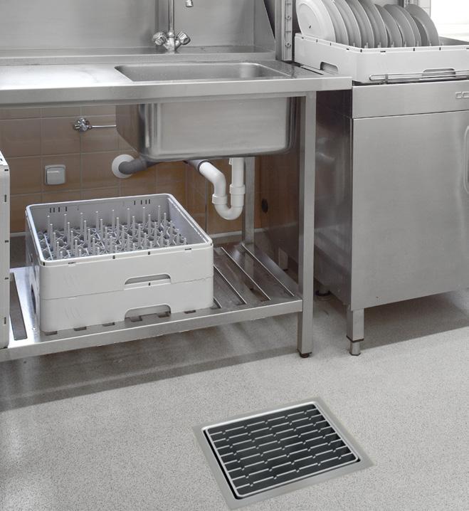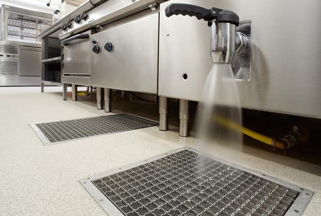 Le drainage des sols a également une importance prépondérante dans ces zones, en particulier devant les grands lave-vaisselles à convoyeur ou à avancement automatique, ou encore au centre de toute zone de lavage de la vaisselle ou des ustensiles de cuisine.