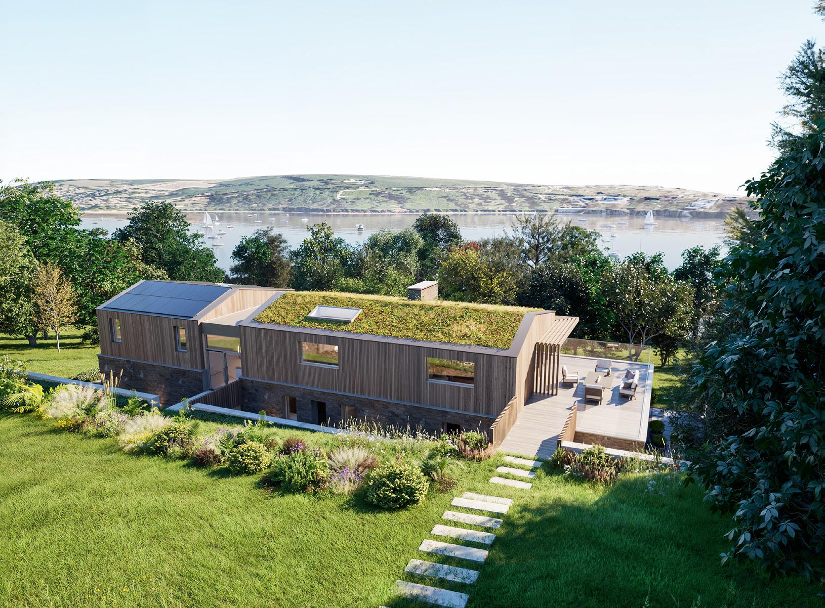Designed to a high architectural quality in line with the Cornwall Design Guide, the sustainable form and superior materials are in keeping with the Cornish vernacular and its appearance should minimise impact upon the wider landscape. Timber cladding to the first floor reflects its woodland surroundings whilst the stone ground floor it sits on references the iconography of Cornish hedges.