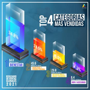 En las ventas globales por productos, la ca tegoría de ´bienestar´ ocupa el primer lugar con el 34.8% de participación, lo cual significa ventas de 64.8 Billones de dólares, seguida por la línea de cosméticos con participación del 24.5%, facturando 45.6 Billones de dóla res.