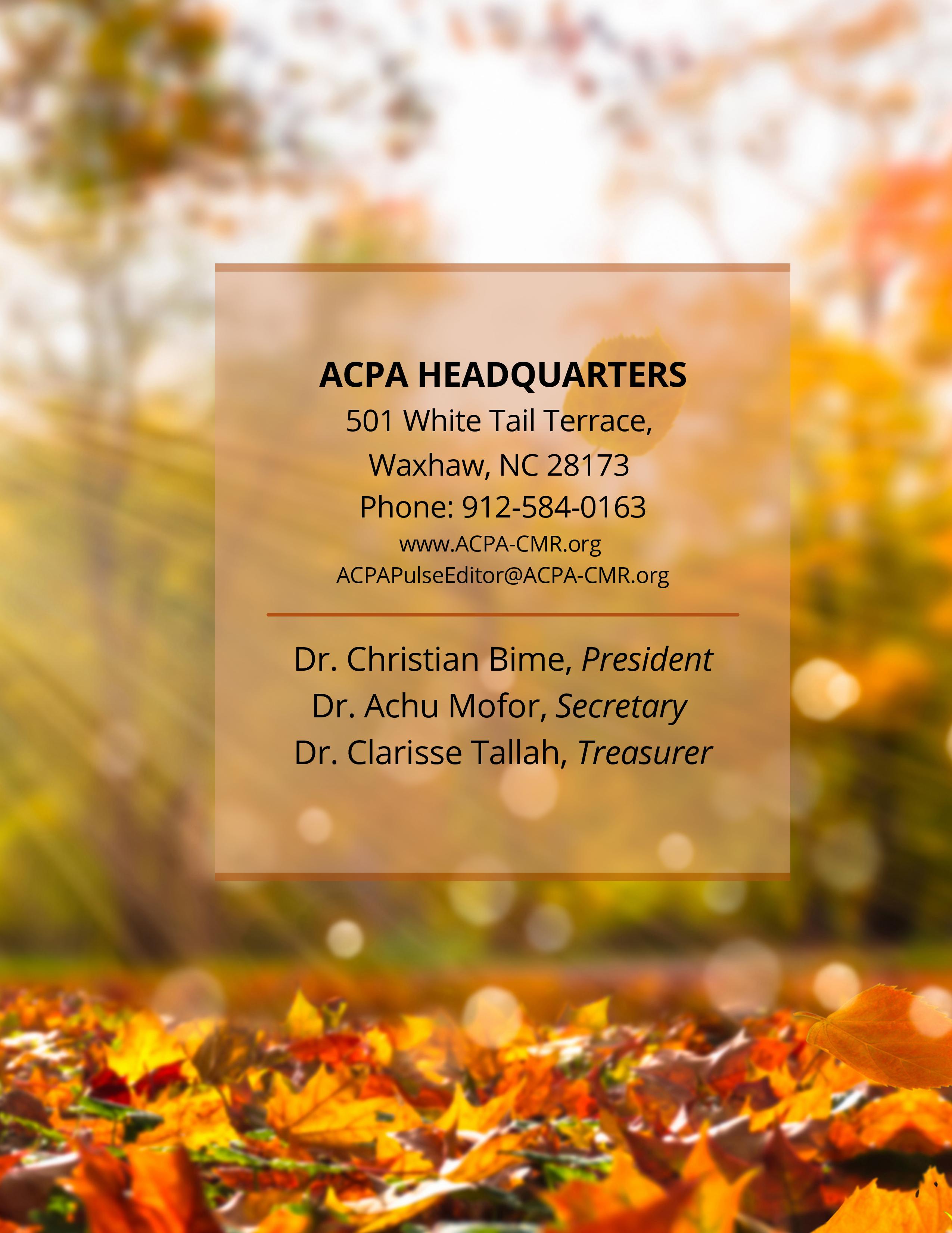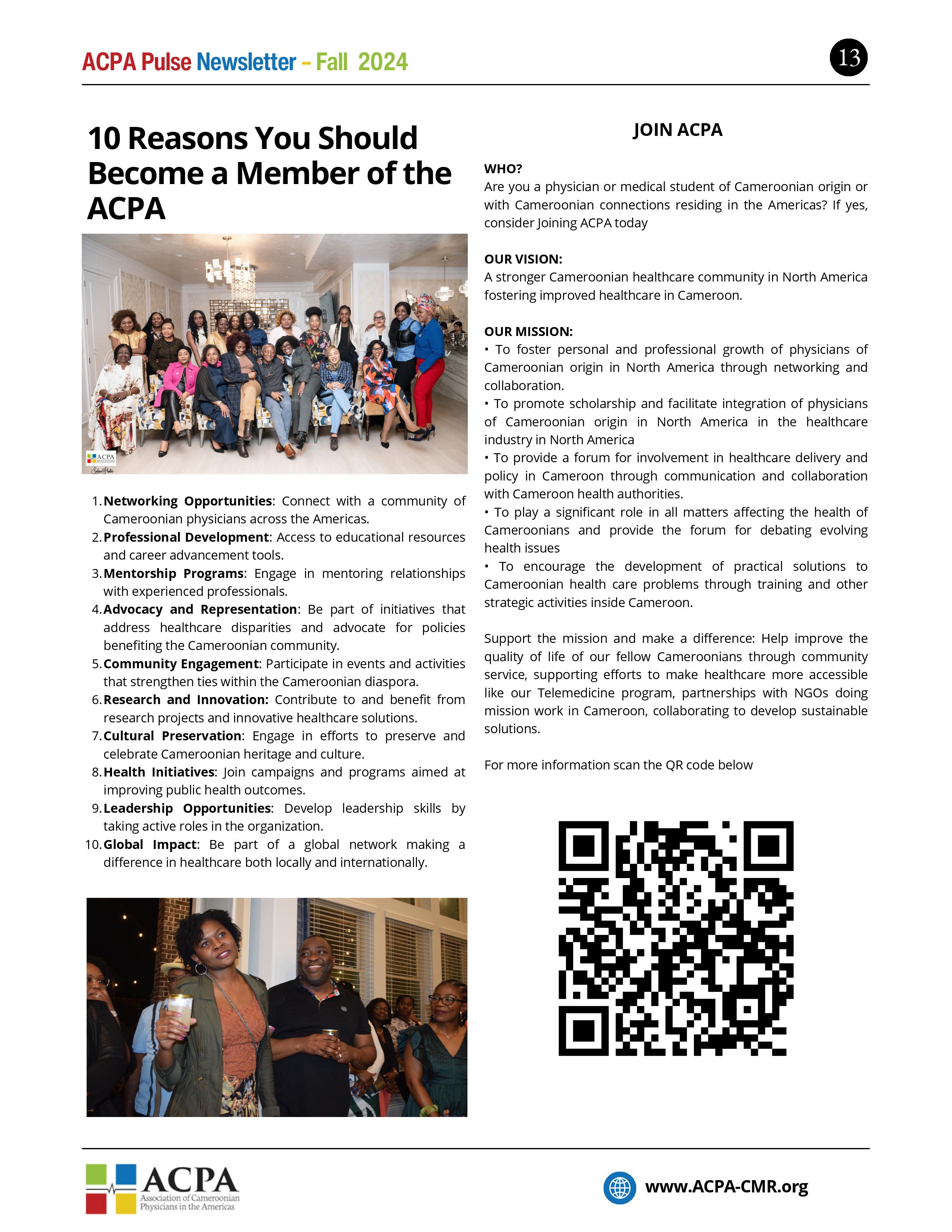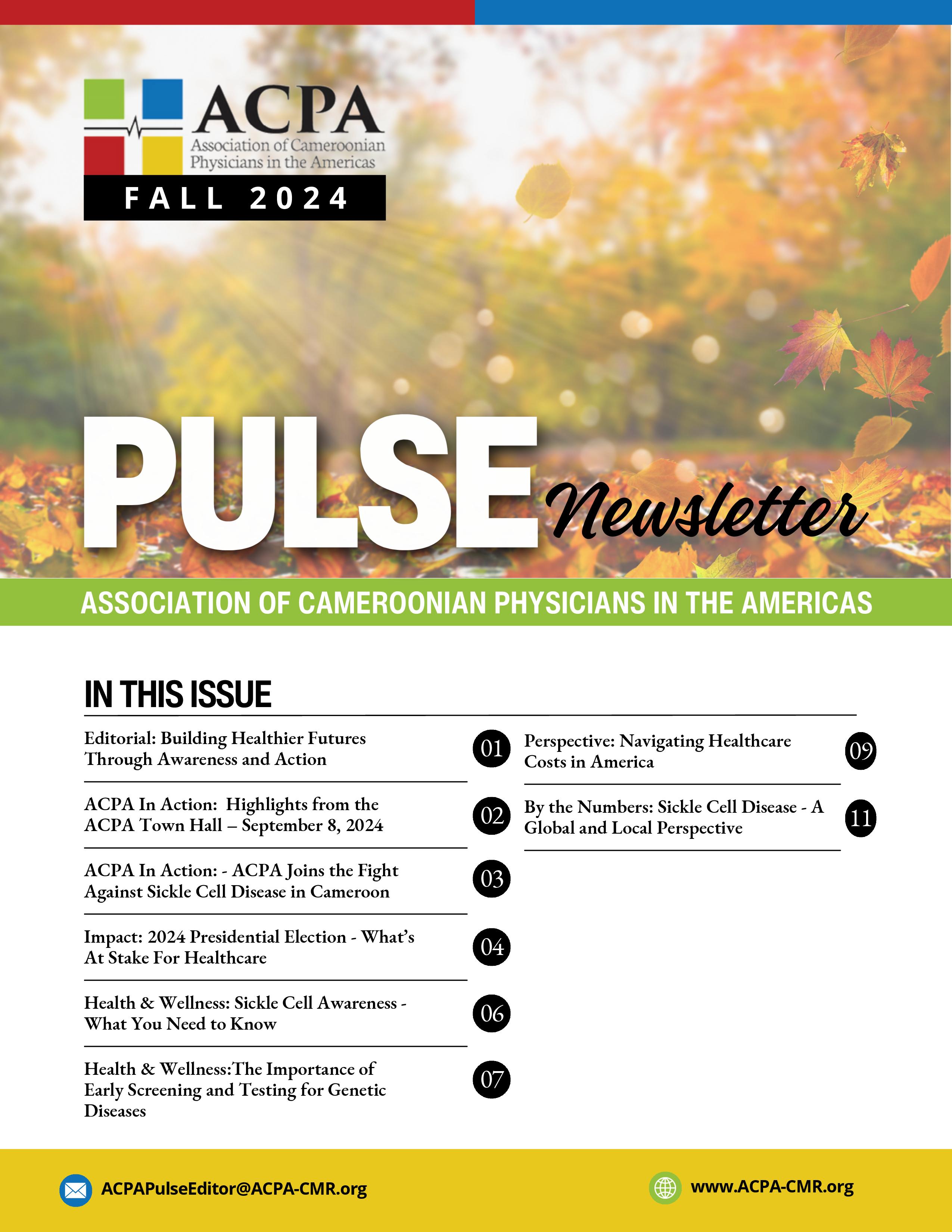 Explore the latest edition of 'The Pulse,' your premier source for connecting with Cameroonian physicians across the Americas. Discover insightful updates, member spotlights, and upcoming events tailored to our vibrant community. Join us in celebrating achievements and staying engaged with the pulse of our association. Dive in now and be a part of the ACPA journey through 'The Pulse'!