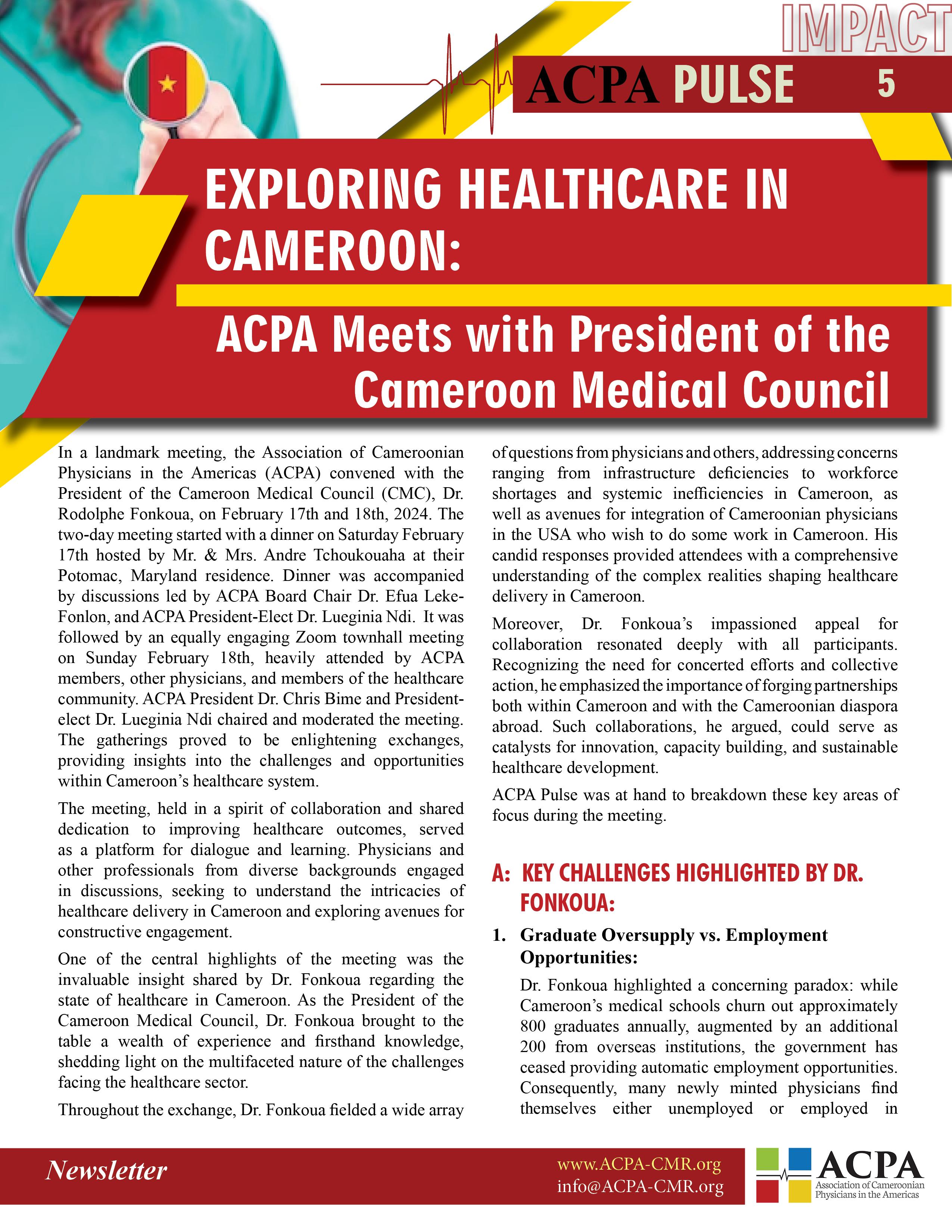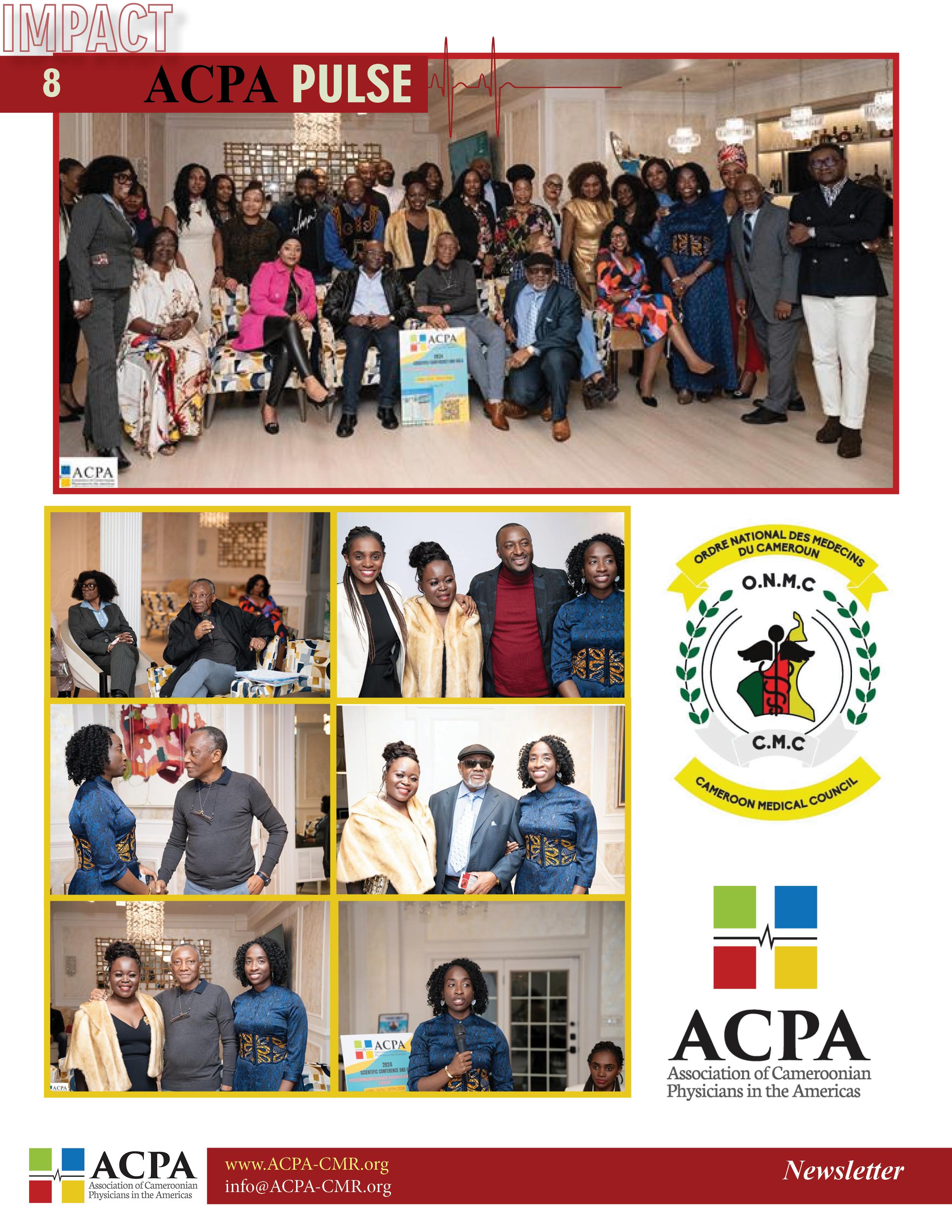 "Explore the latest edition of 'The Pulse,' your premier source for connecting with Cameroonian physicians across the Americas. Discover insightful updates, member spotlights, and upcoming events tailored to our vibrant community. Join us in celebrating achievements and staying engaged with the pulse of our association. Dive in now and be a part of the ACPA journey through 'The Pulse'!"