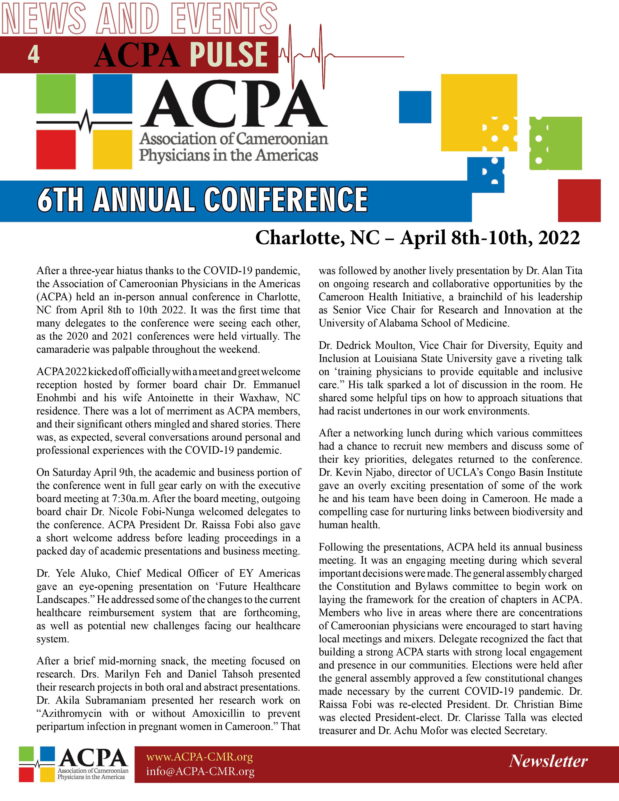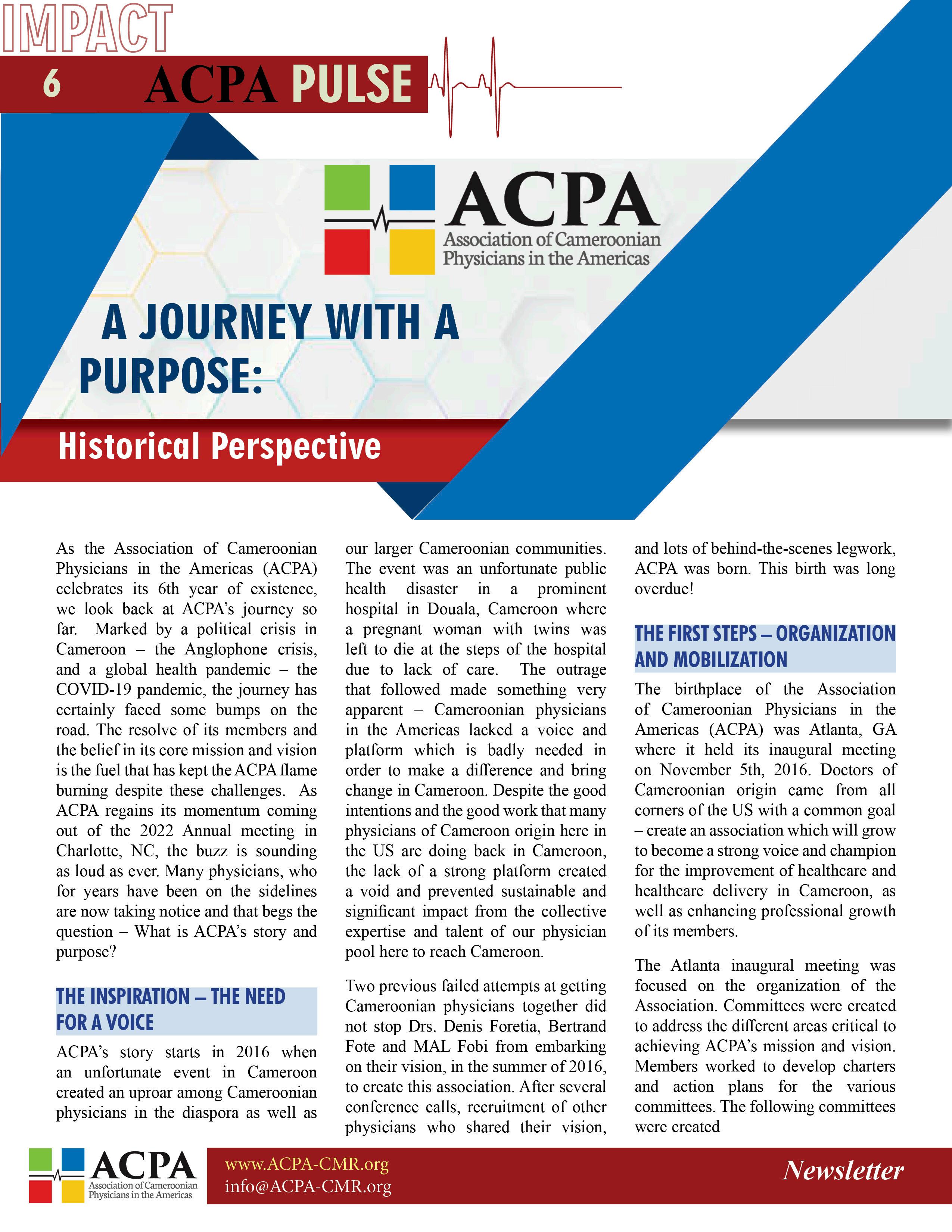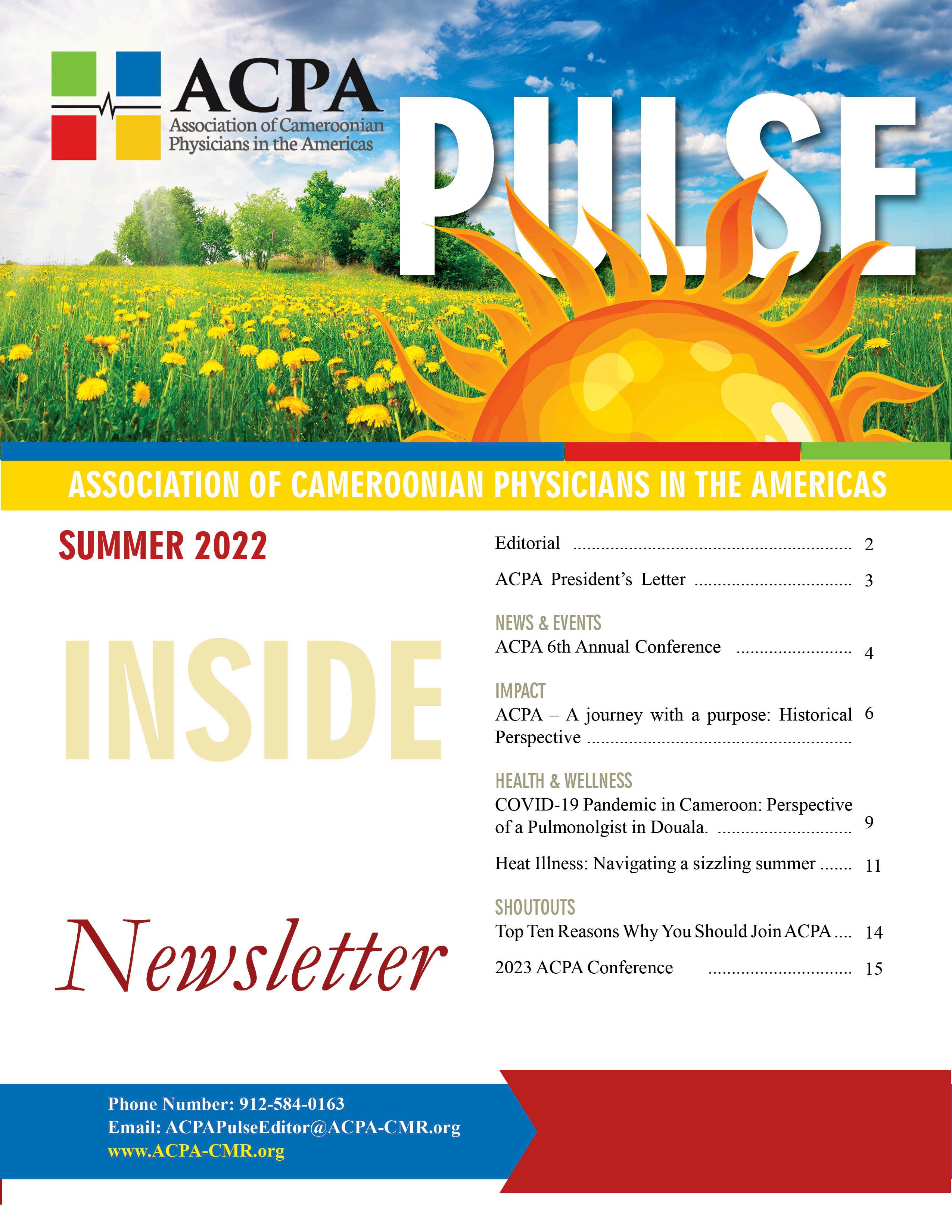 Explore the latest edition of 'The Pulse,' your premier source for connecting with Cameroonian physicians across the Americas. Discover insightful updates, member spotlights, and upcoming events tailored to our vibrant community. Join us in celebrating achievements and staying engaged with the pulse of our association. Dive in now and be a part of the ACPA journey through 'The Pulse'!