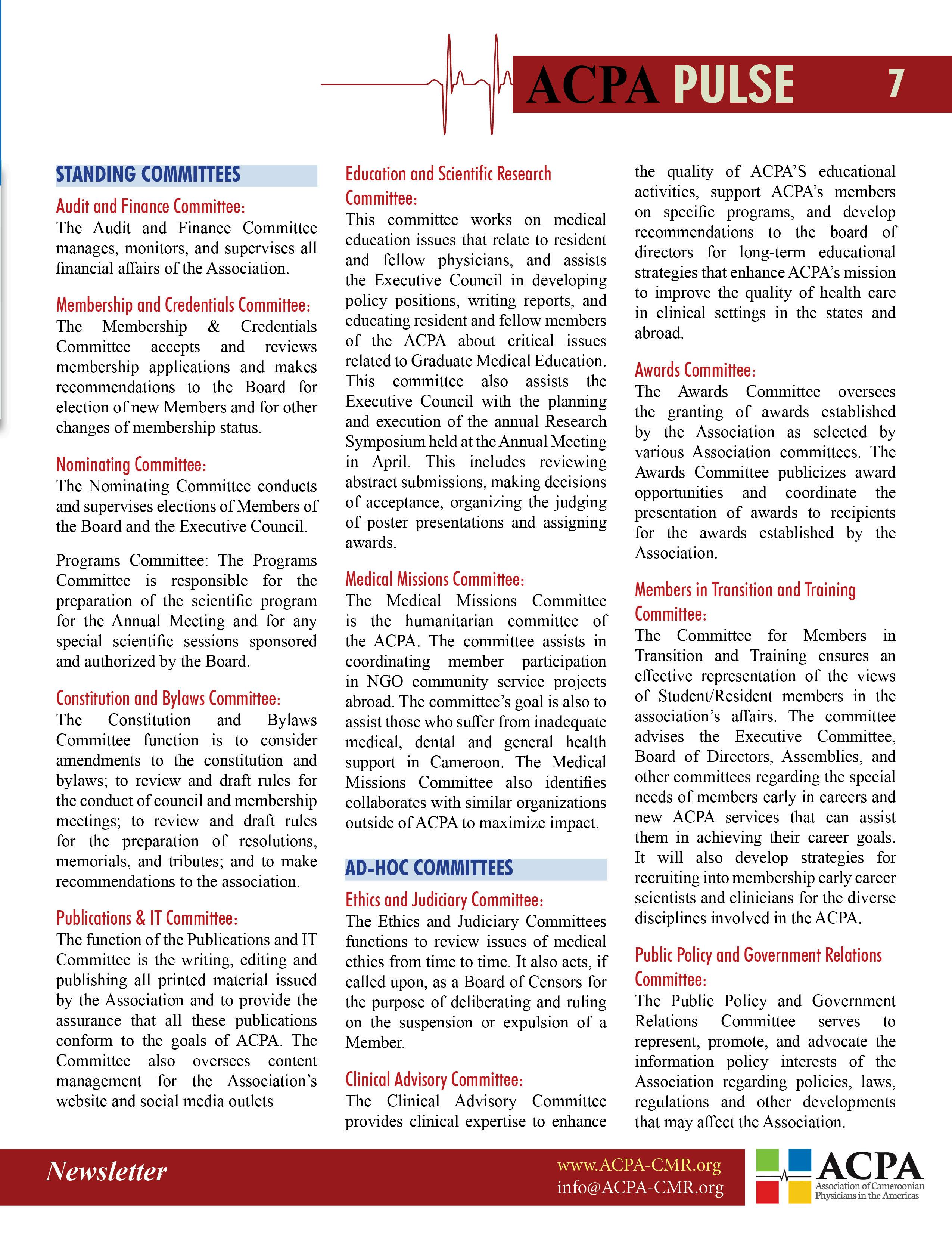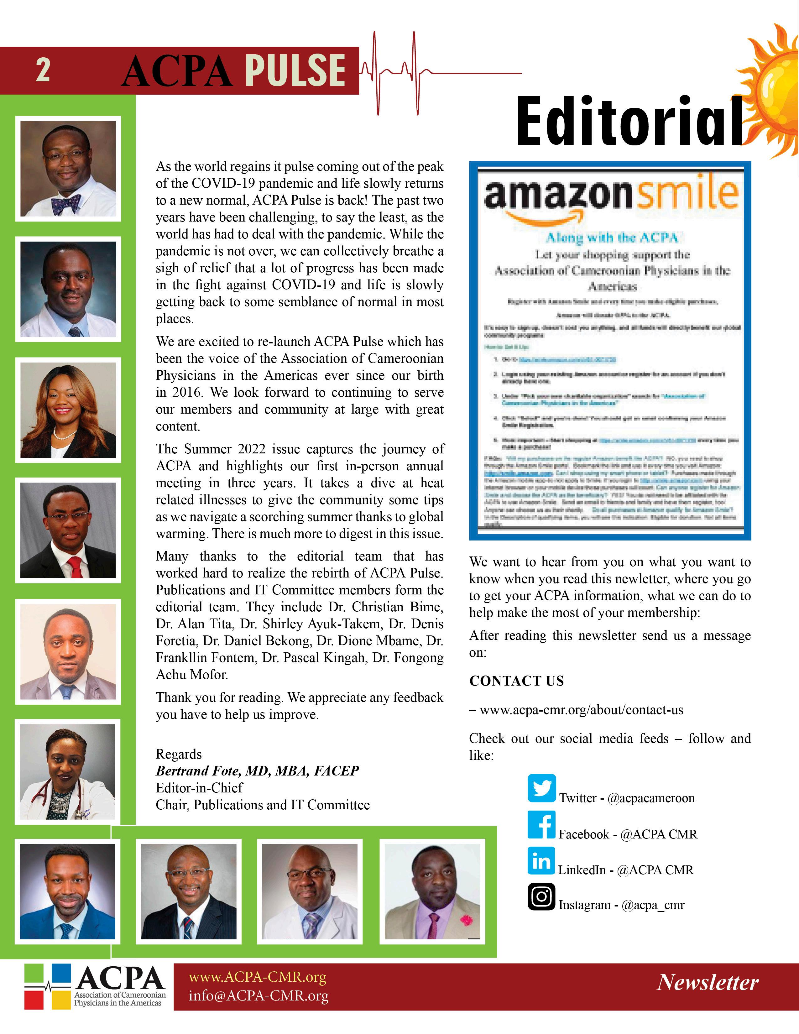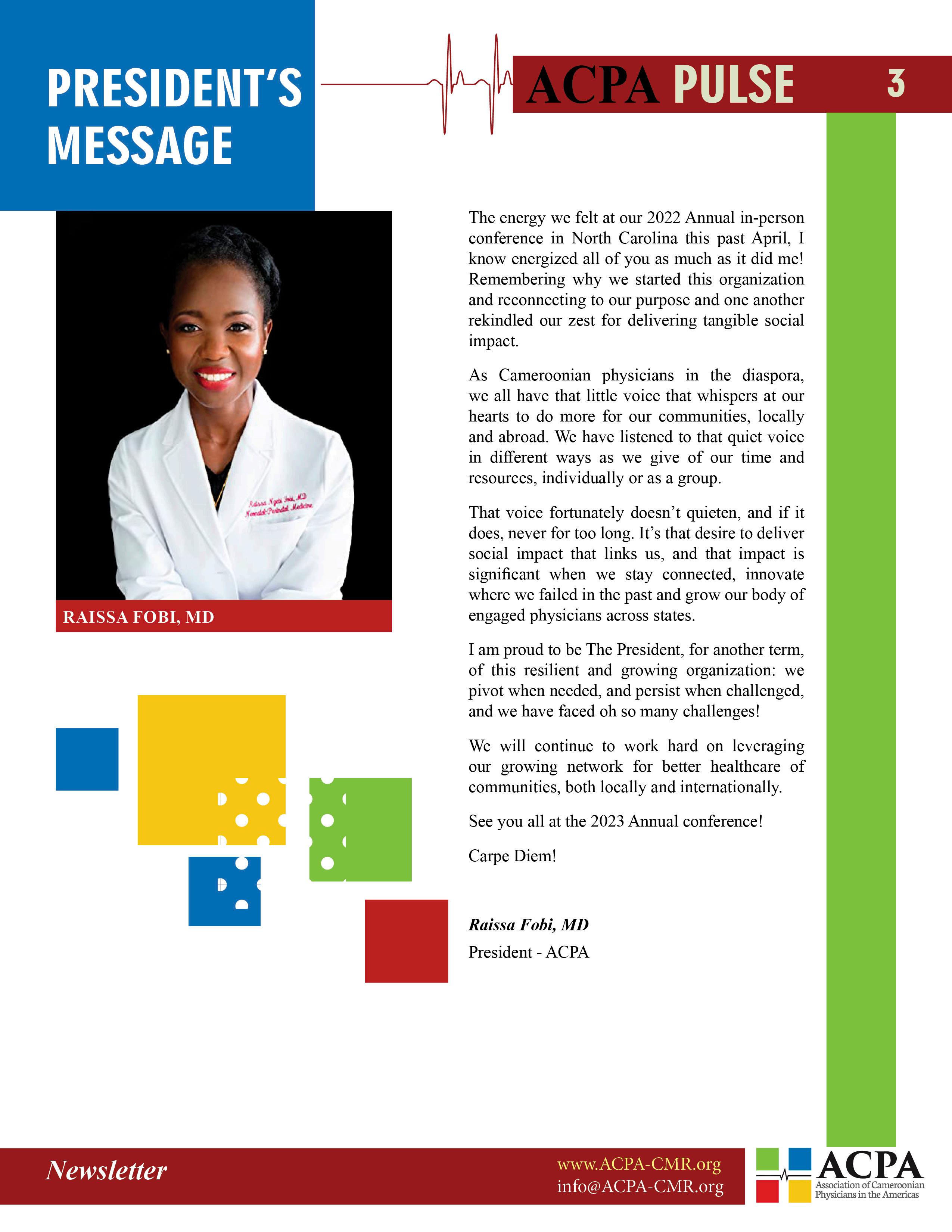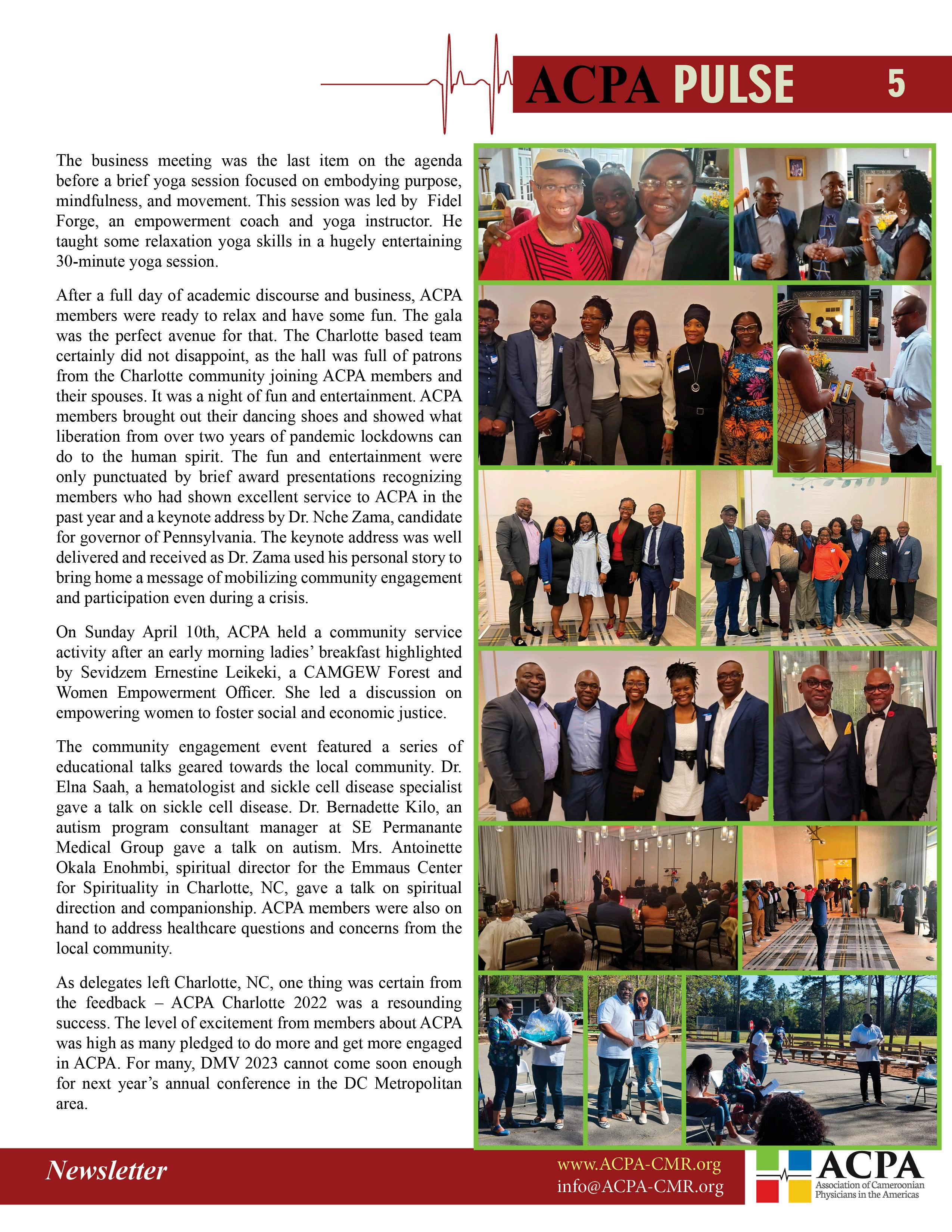 Explore the latest edition of 'The Pulse,' your premier source for connecting with Cameroonian physicians across the Americas. Discover insightful updates, member spotlights, and upcoming events tailored to our vibrant community. Join us in celebrating achievements and staying engaged with the pulse of our association. Dive in now and be a part of the ACPA journey through 'The Pulse'!