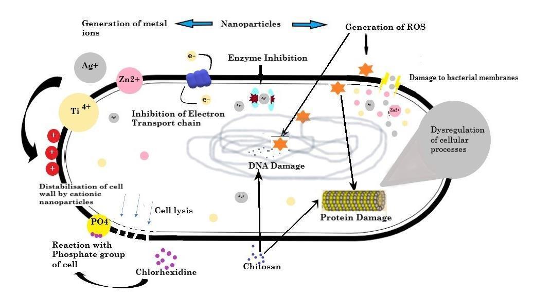 Electrostatic interaction may easily deposit NPs in grampositive bacteria's peptidoglycan layer, interrupting bacterial cell division [36]. Cationic compounds can destroy bacterial cell wall and cell membrane structure, exposing the cell membrane to osmotic shock and cytoplasmic exudation, finallyleadingtocelldeath[37] NPstheninteractwithDNA, lysosomes, ribosomes, and enzymes in the bacterial cell, resulting in oxidative stress by overproduction of reactive oxygen species in the cell, alterations in membrane and its permeability potential by breaking the covalent double bond present in fatty acids, electrolyte imbalance, enzyme inhibition, protein degeneration and deactivation, and gene expression changes [38]. Chlorhexidine reacts with phosphate group of the bacterial cell membrane leading to disintegration of cell membrane, hence exosmosis and cell disruption. The following mechanisms have been proposed most frequently in recent research: non-oxidative processes, oxidative stress, and metal ion release [39-42]