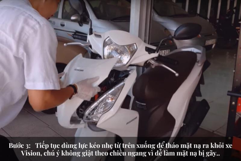 • Bước 2: Tháo nhẹ 2 lẫy ở dưới mặt nạ xe Vision ra bằng vật nhọn. • Bước 3: Tiếp tục dùng lực kéo nhẹ từ trên xuống để tháo mặt nạ ra khỏi