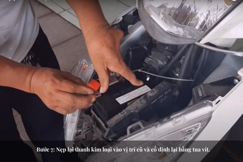 • Bước 4: Bây giờ bạn đã nhìn thấy bình ắc quy của xe Vision, hãy dùng tuốc nơ vít tháo hai dây điện cực cũng như các con ốc trên thanh để sửa bình ắc quy xe Vision. Cần lưu ý rằng nên tháo cực âm trước. • Bước 5: Nhấc bình cũ ra khỏi xe một cách nhẹ nhàng • Bước 6: Thay bình mới vào đúng vị trí ban đầu của bình cũ trên xe, xoáy 2 ốc và dây điện 2 cực vào lại bình mới. • Bước 7: Nẹp lại thanh kim loại vào vị trí cũ và cố định lại bằng tua vít.