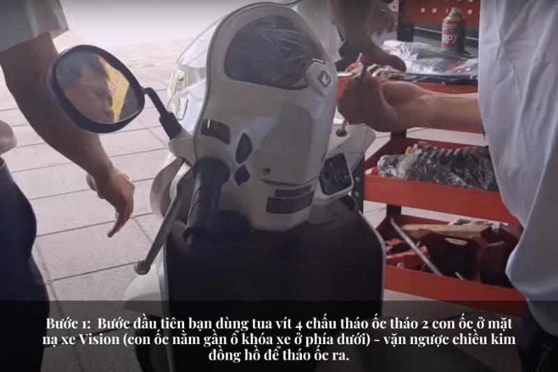 c phù hợp) Tua vít 4 chấu Các bước thay bình ắc quy Vision • Bước 1: Bước đầu tiên bạn dùng tua vít 4 chấu tháo ốc tháo 2 con ốc ở mặt nạ xe Vision (con ốc nằm gần ổ khóa xe ở phía dưới) vặn ngược chiều kim đồng hồ để tháo ốc ra.