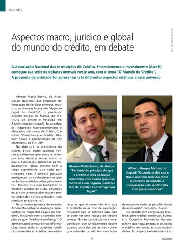 Aspectos macro, jurídico e global do mundo do crédito, em debate A Associação Nacional das Instituições de Crédito, Financiamento e Investimento (Acrefi) começou sua série de debates mensais neste ano, com o tema “O Mundo do Crédito”. A proposta da entidade foi apresentar três diferentes aspectos relativos a esse universo