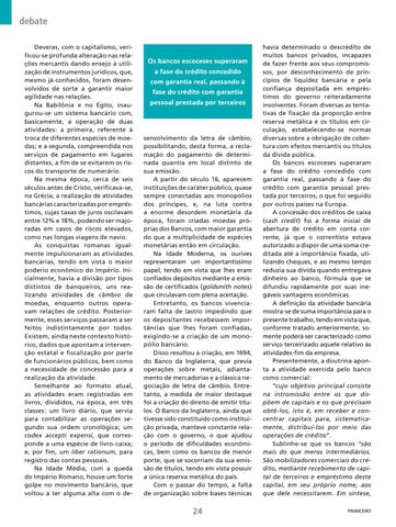 debate Deveras, com o capitalismo, verificou-se profunda alteração nas relações mercantis dando ensejo à utilização de instrumentos jurídicos, que, mesmo já conhecidos, foram desenvolvidos de sorte a garantir maior agilidade nas relações. Na Babilônia e no Egito, inaugurou-se um sistema bancário com, basicamente, a operação de duas atividades: a primeira, referente à troca de diferentes espécies de moedas; e a segunda, compreendida nos serviços de pagamento em lugares distantes, a fim de se evitarem os riscos do transporte de numerário. Na mesma época, cerca de seis séculos antes de Cristo, verificava-se, na Grécia, a realização de atividades bancárias caracterizadas por empréstimos, cujas taxas de juros oscilavam entre 12% e 18%, podendo ser majoradas em casos de riscos elevados, como nas longas viagens de navio. As conquistas romanas igualmente impulsionaram as atividades bancárias, tendo em vista o maior poderio econômico do Império. Inicialmente, havia a divisão por tipos distintos de banqueiros, uns realizando atividades de câmbio de moedas, enquanto outros operavam relações de crédito. Posteriormente, esses serviços passaram a ser feitos indistintamente por todos. Existem, ainda neste contexto histórico, dados que apontam a intervenção estatal e fi scalização por parte de funcionários públicos, bem como a necessidade de concessão para a realização da atividade. Semelhante ao formato atual, as atividades eram registradas em livros, divididos, na época, em três classes: um livro diário, que servia para contabilizar as operações segundo sua ordem cronológica; um codex accepti expensi, que corresponde a uma espécie de livro-caixa; e, por fim, um liber rationum, para registro das contas pessoais. Na Idade Média, com a queda do Império Romano, houve um forte golpe no movimento bancário, que voltou a ter alguma alta com o de-
