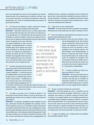 RF – Há sobre a sua mesa o livro “O Capital no Século 21”, do economista francês Thomas Piketty, em que se retrata que a desigualdade põe a democracia em cheque. O senhor concorda com essa análise? Giannetti – Eu defendo a igualdade de oportunidades. Eu acho que a dimensão relevante da igualdade são condições minimamente igualitárias para que os indivíduos possam desenvolver seu potencial plenamente. Não acho que a igualdade de resultados seja sequer desejável, porque as pessoas são diferentes, têm valores diferentes, e nem todas elas estão interessadas em medir sua vida com base em uma métrica econômico-financeira, ainda bem. O que é injustificável e intolerável são as desigualdades nas 12 financeiro julho 2014
