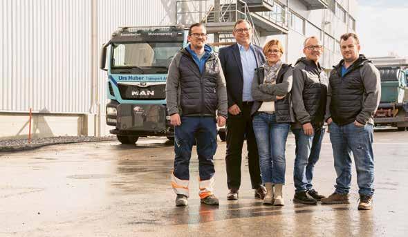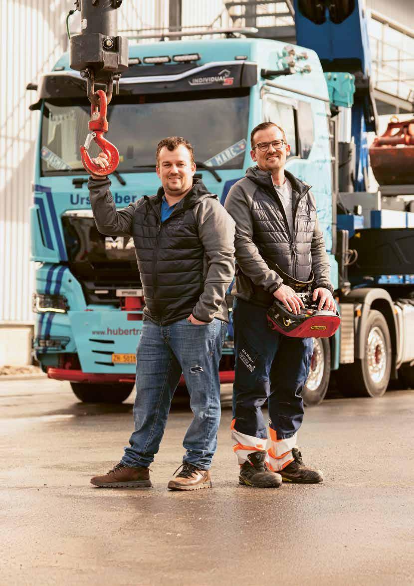 Sperrmüllentsorgung und -sortierung, Logistik und Werkstattdienstleistungen hinzu. Und heute? «Wir sind 36 Mitarbeitende, Tendenz steigend. Dabei bilden wir sechs Lernende in den Fachrichtungen Strassentransportfachmann und Recyclistin aus», so André Huber. Auch in der Garage gab es gehörig Zuwachs: 21 Lastwagen und diverse Fahrzeuge, Tieflader, Kippsattelschlepper und Baumaschinen bilden die moderne Fahrzeug flotte. Der aktuellste Neuzugang wird täglich von Marc Huber gefahren und mit viel Fingerspitzengefühl bedient –ein 5-Achs-Kranwagen, der bis zu 30 Tonnen heben und mit voll ausgefahrenem 50-Meter-Arm noch gut 350 Kilo punktgenau platzieren kann.