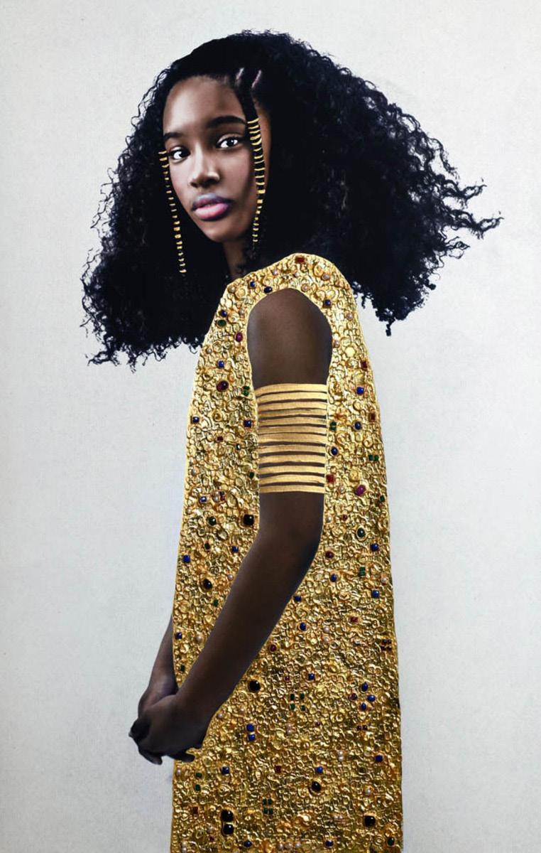 Tawny Chatmon is a Maryland-based artist whose work focuses on the beauty and value of Black children. Using her experience as a professional photographer to take stunning portraits of her subjects, Chatmon then embellishes the compositions with gold-leaf to emphasize their worth. The painting techniques that the artist uses are very reminiscent of that of Gustav Klimt, whose work is often revered for its use of gold-leaf. However, Chatmon turns this tradition on its head by bringing Black bodies to the forefront of the canvas, as opposed to the margins where they historically reside. In most of her portraits, the background is left blank, leaving these children as the only focal point.