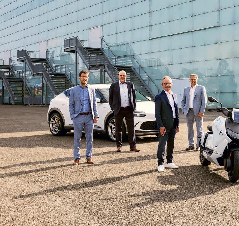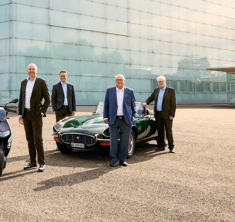 Das Direktionskomitee (CD) v. l. n. r.: Julien Broquet (Vizepräsident), Michael Schäufele, Nicolas Leuba, Christian Müller, Thomas Hurter (Zentralpräsident), Alex Farinelli, Peter Hirn, Beat Studer; Zur Verfügung gestellte Fahrzeuge: Genesis GV60 von Genesis Motor Switzerland AG, BMW CE 04 von Autoverkehr Bern Motorrad, Jaguar E-Type Roadster von Emil Frey Classics AG