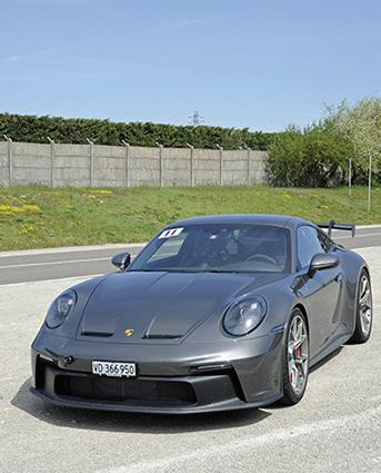 et couple de 470 N.m propulsent l’engin de 0 à 100 km/h en 3,4 secondes. Il franchit allègrement la barre des 300 km/h, pour culminer à 318 km/h. En soutien à cette cavalerie, la boîte de vitesses PDK à sept rapports, et, bien plus discrets, les éléments allégés, tels le toit en fibre de carbone, les sièges du même matériau et aussi les freins en carbone/céramique. Tout cela pour ramener l’ensemble à 1435 kilos. Un joli rapport poids/puissance. En conclusion, une Porsche dans la plus pure tradition de la marque, qui place une fois encore la barre de cette 992 GT3 un degré plus haut que les modèles précédents. Souhaitons ardemment que la politique actuelle, véritable chasse aux grands fauves hurlant dans les hauts régimes, s’assouplisse pour que puisse se perpétuer la tradition des voitures plaisirs.