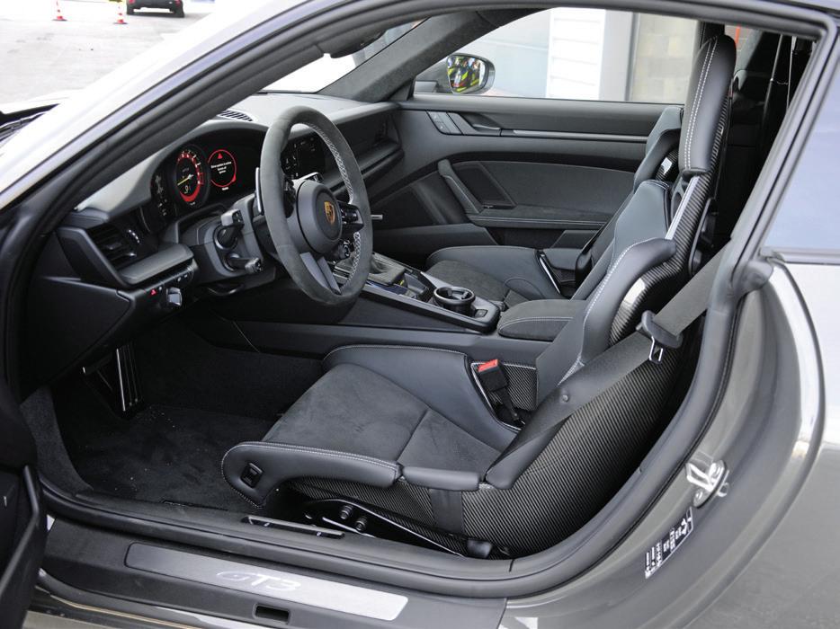 en col-de-cygne, pour améliorer l’écoulement de l’air et diminuer la traînée sans pénaliser l’appui, il permet de générer 385 kilos d’appui à 200 km/h, lorsqu’il est braqué au maximum. Autre «détail», qui ne saute pas aux yeux, la voie avant a augmenté de presque cinq centimètres, ce qui n’est sans doute pas étranger à cette faculté à bien engager le train avant en virages. Voilà pour le visuel extérieur, mais l’intérieur lui aussi respecte la tradition, tout en s’améliorant de quelques petites retouches. Pas de réelle révolution, on retrouve les fondamentaux de la 992 «standard». Les baquets carbone, toujours sublimes, offrent une position de conduite parfaite et plutôt confortable en usage routier, eh oui ! Parfaitement enveloppants, ils sont également proches de la perfection lorsqu’on emmène la GT3 sur un circuit. Dès cet instant, place aux réglages appropriés. Une mollette permet