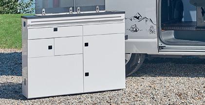 Eigentliches Highlight des Umbaus vom Transporter zum Camper ist denn auch die modulare Küche. Das vordere Modul ist auf einem Schienensystem gelagert und lässt sich bei Bedarf komplett ausbauen, um auch im Freien kochen zu können. Dazu gibt es eine praktische zusätzliche Tischverlängerung und einen Stromanschluss im Aussenbereich.