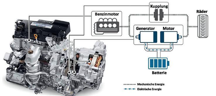Generator, die andere als Antriebsmotor dient. Bei hohen Leistungsanforderungen wird der Benzinmotor direkt mit den Antriebsrädern verbunden – wenn nötig mit BoostUnterstützung durch die Elektromaschine. Automatisch wählt das
