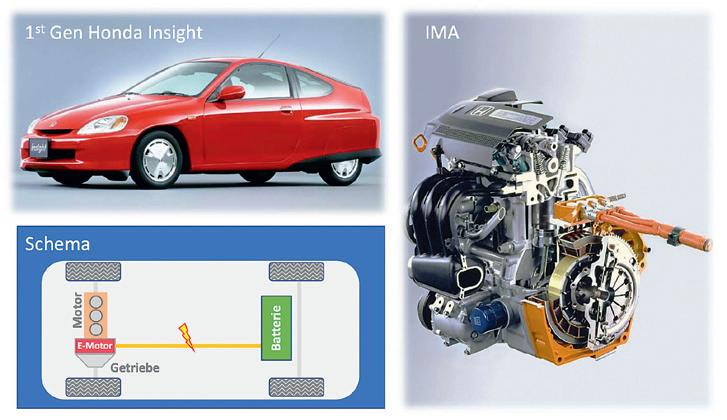 Honda lancierte 1999 den nur 850 Kilogramm wiegenden Zweisitzer Insight. Mit dem Parallelhybridsystem IMA (Integrated Motor Assist) und AluKarosserie erzielte das Auto einen Benzinverbrauch von 3,4 l/100 km. Der 1LiterMagermixDreizylinder lieferte zusammen mit dem kleinen Elektromotor 60 kW (82 PS) und die kleine NickelMetallhydridBatterie wog nur 20 Kilogramm. Die Insight Generationen zwei und drei starteten 2009 und 2018 als Fünfsitzer mit 1,3 respektive 1,5LiterBenzinmotor und EMaschine.