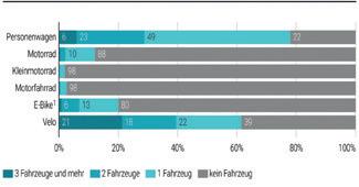 78% der schweizerischen Haushalte besassen 2021 mindestens ein Auto, in nahezu jedem dritten Haushalt (29%) waren gar zwei oder mehr Personenwagen vorhanden. Ebenfalls weit verbreitet waren weiterhin Velos, von denen 61% der Haushalte mindestens eines besassen. Deutlich dahinter folgten die E-Bikes (20%), Motorräder (12%), Motorfahrräder und Kleinmotorräder (jeweils 2%). Der Prozentwert der E-Bikes umfasst sowohl die sogenannten «schnellen» als auch die «langsamen» Fahrzeuge.