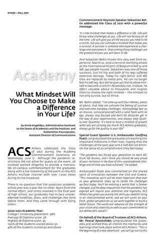 Ethos is an annual publication showcasing the life and activity of the Institution of ACS Athens.