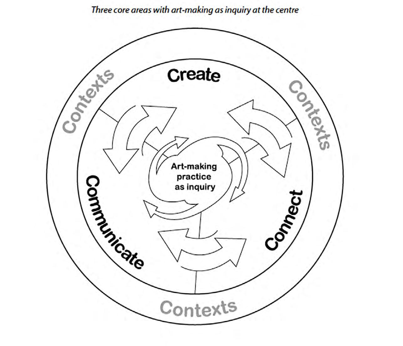 This section defines the learning and teaching to be covered in each of the three core areas. As shown in the figure below, create, connect and communicate are integrated when students engage in art-making as inquiry, interacting as artists with the work of others and with the contemporary world.