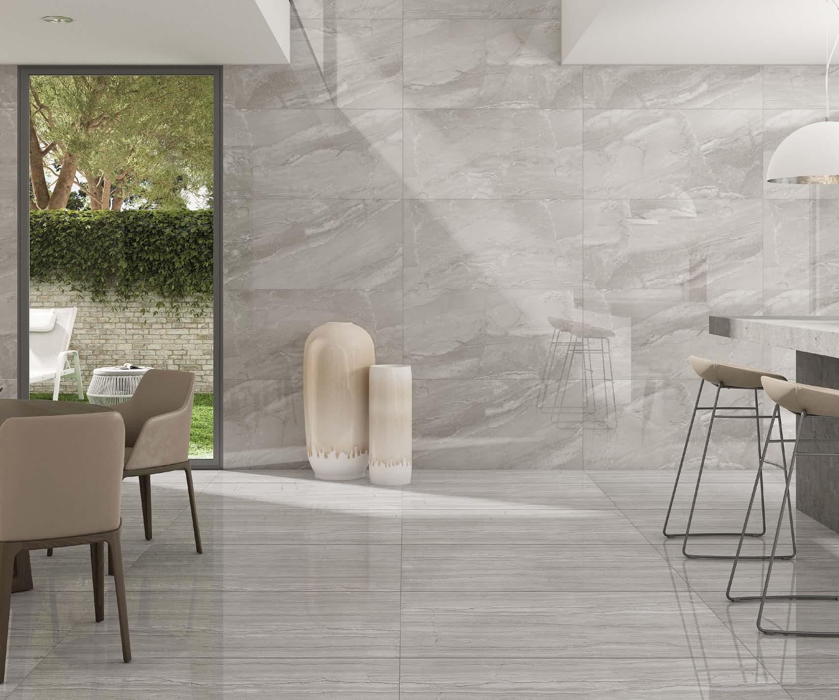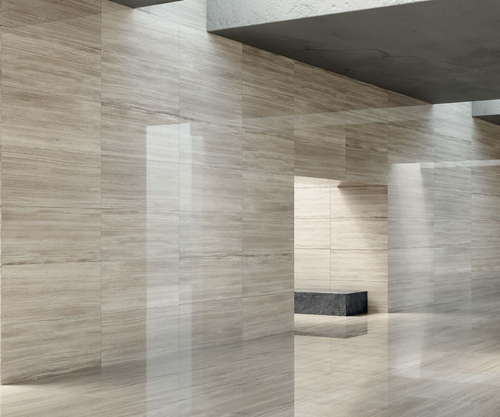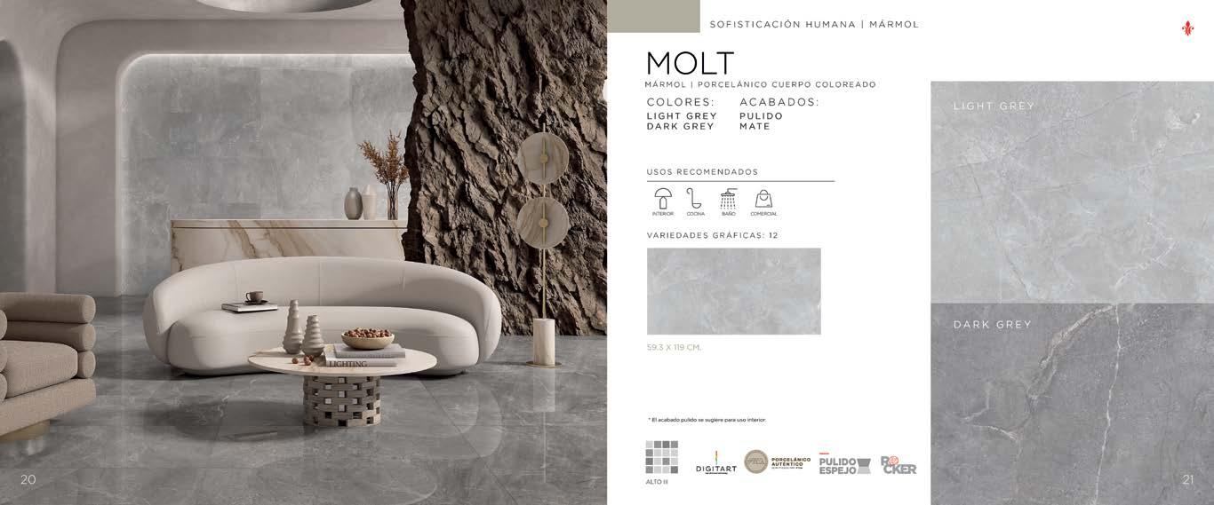 * El acabado pulido se sugiere para uso interior y esta disponible en el formato 59.3x119 en el color Bone.