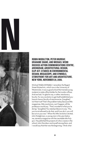 Robin Middleton, Peter Murray, Grahame Shane, and Michael Webb discuss Action Communications Centre, Archigram, Architectural Design, Clip-Kit: Studies in Environmental Design, Megascope, and Symbols. Storefront for Art and Architecture. New York, November 28, 2006. Michael Webb (MWebb): I remember the Regent Street Polytechnic, which now is the University of Westminster; it was a good school that trained young students to make office fodder for the London offices. And we had, I’m glad to say, a rather reactionary faculty. For any revolution to get itself established you have to have a faculty of reactionaries. [Laughter] Isn’t that true? That’s the problem today because little magazines, little revolutions, can’t happen; all the professors would say, “That’s wonderful what you’re doing.” [Laughter] You need professors to say, “No, you’re not allowed to do that, and if you do it, you will be out on your ear.” When this little revolution started, John Hodgkinson, a young man in the year below me, started a magazine with the inevitable title Polygon. He published the projects of a few crazies in the school: John Davidson and myself among them, and I would say that that was the beginning. I think what