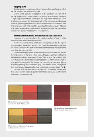 Aggregates Sand and gravel, on account of their natural colors, also have an effect on the shade of the finished concrete. Likewise, the granular composition of the sand can have an effect on the shade under certain conditions, namely when the sand contains a high proportion of fines. The higher the proportion of fines in a sand, the less pronounced the tinting strength of the pigment used. Because there is generally very little fluctuation in the composition of sand from the mine, especially in terms of the quantity of fines, there is very little risk that it will cause differences in shade, although to be on the safe side it is one more aspect that deserves consideration.