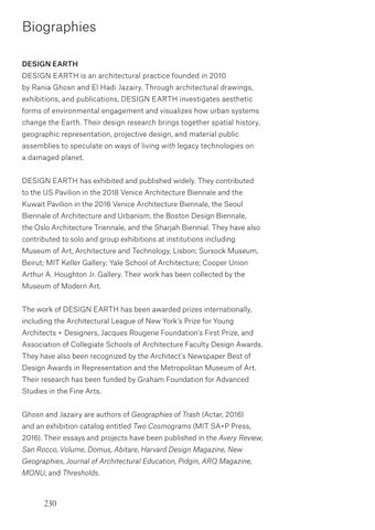 Biographies DESIGN EARTH DESIGN EARTH is an architectural practice founded in 2010 by Rania Ghosn and El Hadi Jazairy. Through architectural drawings, exhibitions, and publications, DESIGN EARTH investigates aesthetic forms of environmental engagement and visualizes how urban systems change the Earth. Their design research brings together spatial history, geographic representation, projective design, and material public assemblies to speculate on ways of living with legacy technologies on a damaged planet. DESIGN EARTH has exhibited and published widely. They contributed to the US Pavilion in the 2018 Venice Architecture Biennale and the Kuwait Pavilion in the 2016 Venice Architecture Biennale, the Seoul Biennale of Architecture and Urbanism, the Boston Design Biennale, the Oslo Architecture Triennale, and the Sharjah Biennial. They have also contributed to solo and group exhibitions at institutions including Museum of Art, Architecture and Technology, Lisbon; Sursock Museum, Beirut; MIT Keller Gallery; Yale School of Architecture; Cooper Union Arthur A. Houghton Jr. Gallery. Their work has been collected by the Museum of Modern Art. The work of DESIGN EARTH has been awarded prizes internationally, including the Architectural League of New York’s Prize for Young Architects + Designers, Jacques Rougerie Foundation’s First Prize, and Association of Collegiate Schools of Architecture Faculty Design Awards. They have also been recognized by the Architect’s Newspaper Best of Design Awards in Representation and the Metropolitan Museum of Art. Their research has been funded by Graham Foundation for Advanced Studies in the Fine Arts. Ghosn and Jazairy are authors of Geographies of Trash (Actar, 2016) and an exhibition catalog entitled Two Cosmograms (MIT SA+P Press, 2016). Their essays and projects have been published in the Avery Review, San Rocco, Volume, Domus, Abitare, Harvard Design Magazine, New Geographies, Journal of Architectural Education, Pidgin, ARQ Magazine, MONU, and Thresholds.